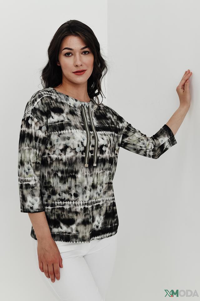 Женский пуловер Betty Barclay чёрно-белого цвета с оригинальным принтом и декоративными завязками на горловине. Модель с рукавом 3/4 выполнена из мягкого и приятного к телу трикотажа. Состав: вискоза 80%, полиэстер 15%, эластан 5%