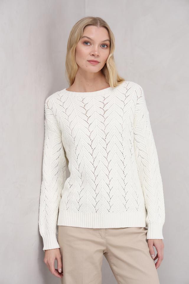 Женский пуловер Broadway молочного цвета выполнен из мягкого трикотажа с ажурным узором. Модель имеет округлый вырез горловины и длинные рукава, идеально подходит для создания уютных и стильных образов. Состав: хлопок 60%, акрил 40%