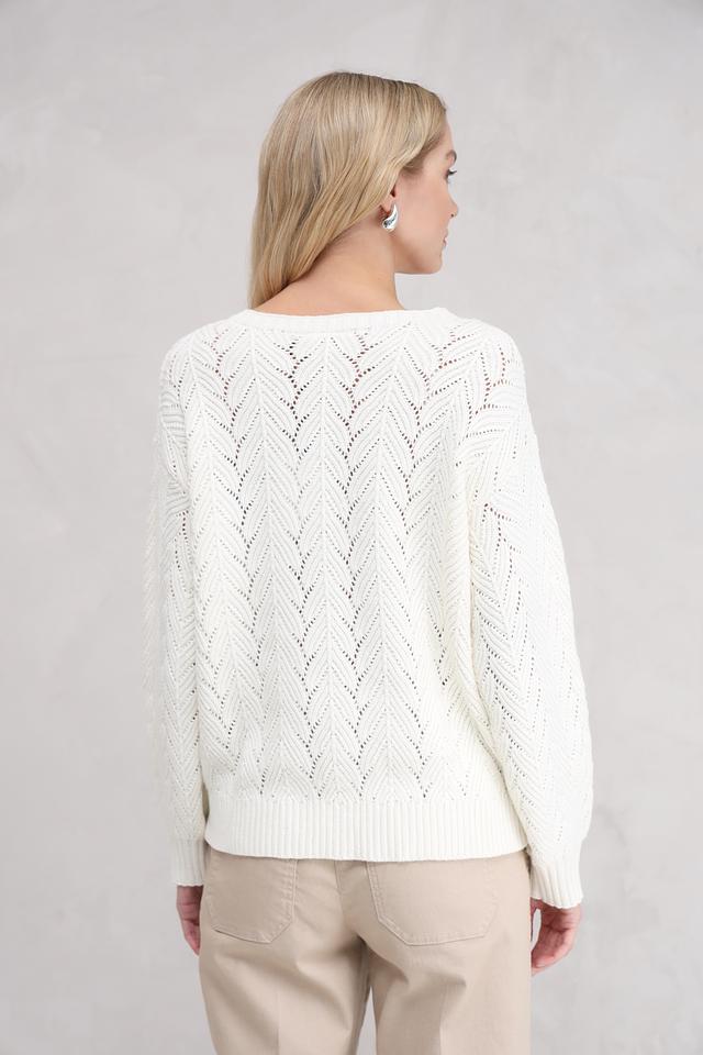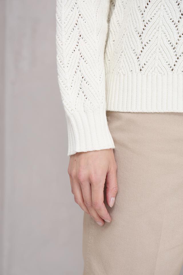 Особенностью данной модели является ажурный узор, который придает ей легкость и изысканность. Округлый вырез горловины и длинные рукава делают этот пуловер универсальным и подходящим для различных случаев. Он отлично сочетается с джинсами, брюками или юбками, позволяя создавать разнообразные стильные образы.