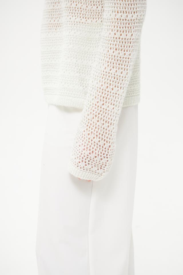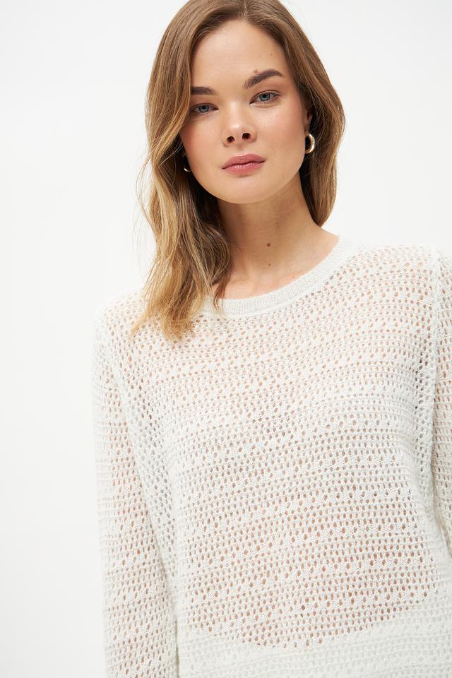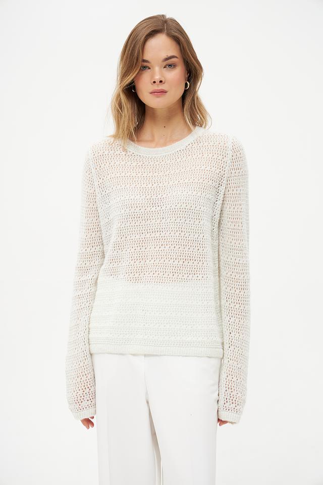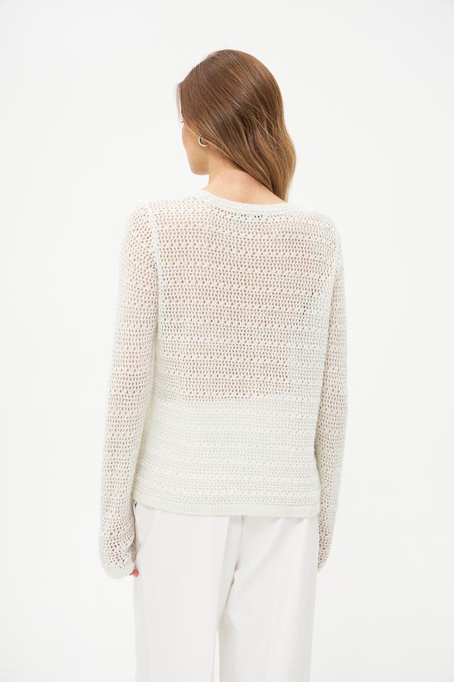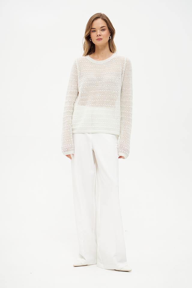 Пуловер имеет свободный крой и ажурную текстуру, которая придает ему легкость и изысканность. Круглый вырез горловины и длинные рукава делают его универсальным для различных образов.