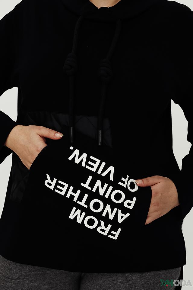 Пуловер имеет свободный крой, капюшон и длинные рукава. Передняя часть украшена ярким принтом с надписью, добавляющим образу индивидуальность и стиль. Боковые разрезы внизу изделия придают ему современный вид.