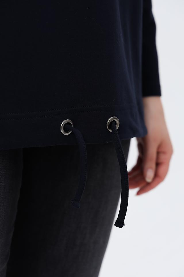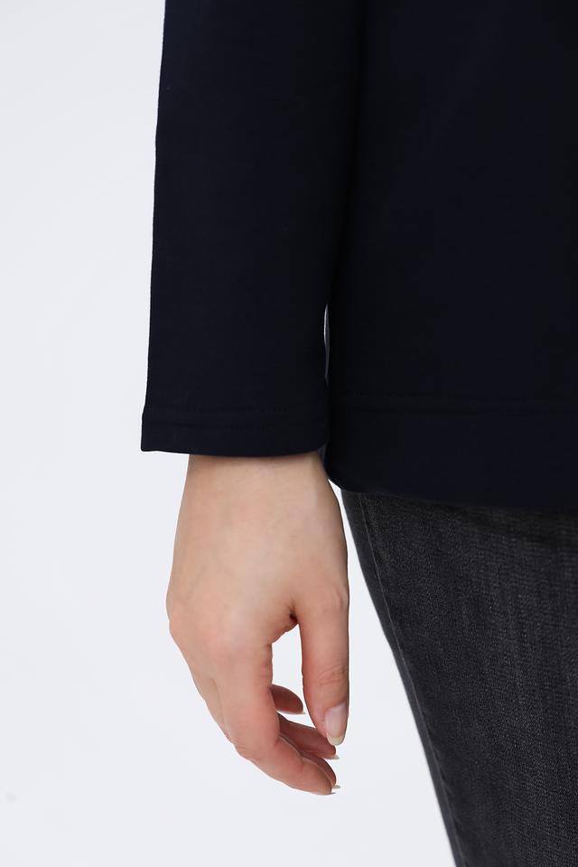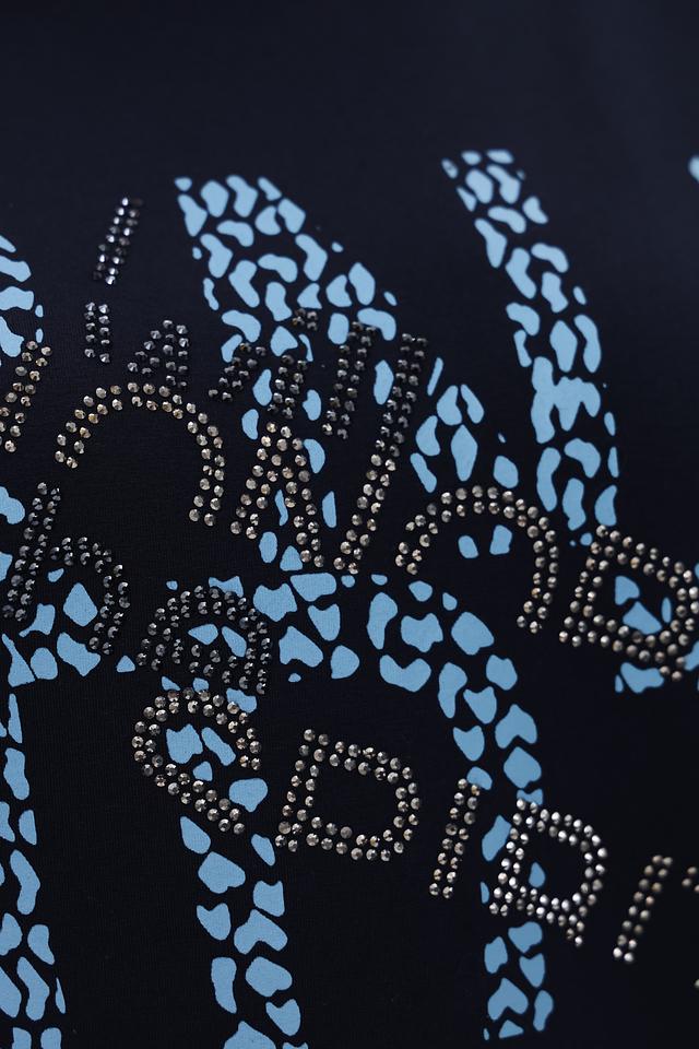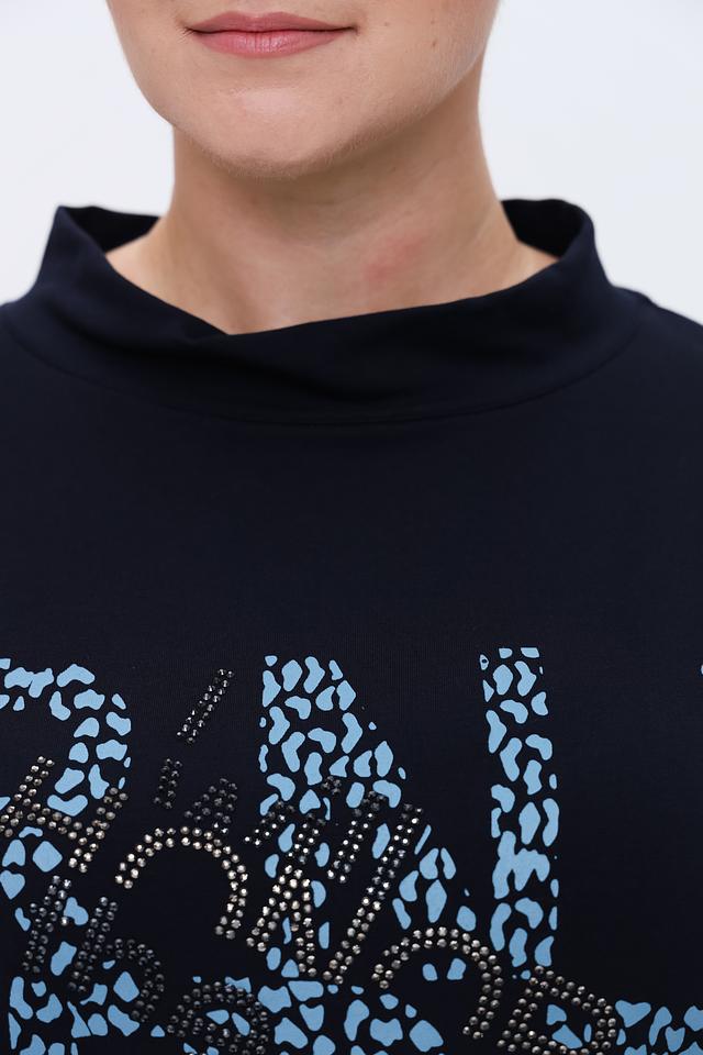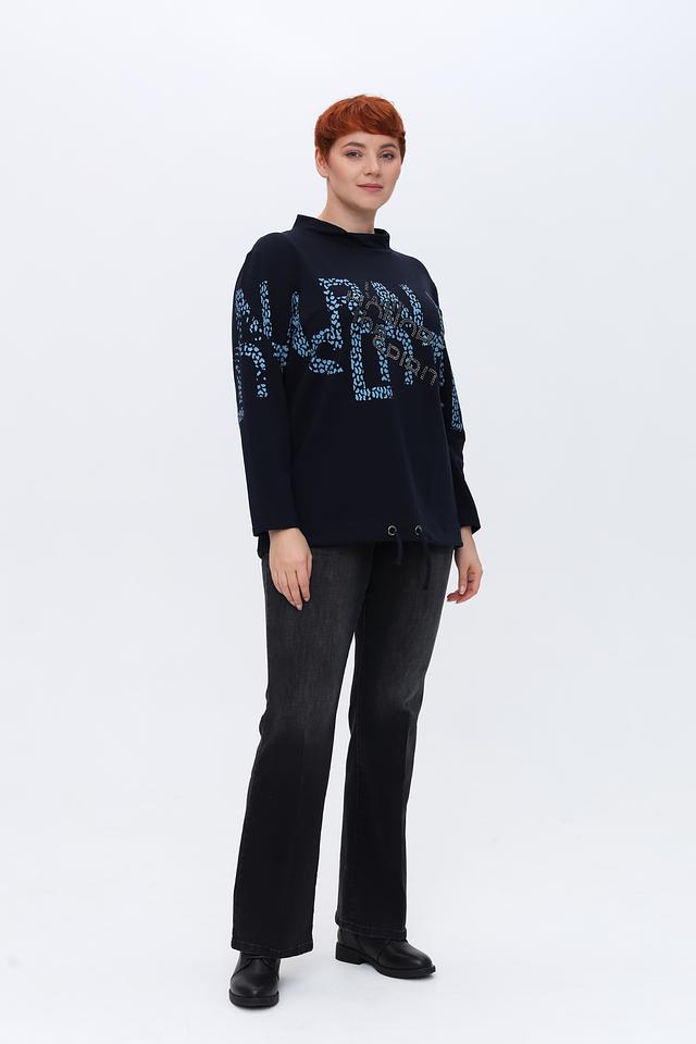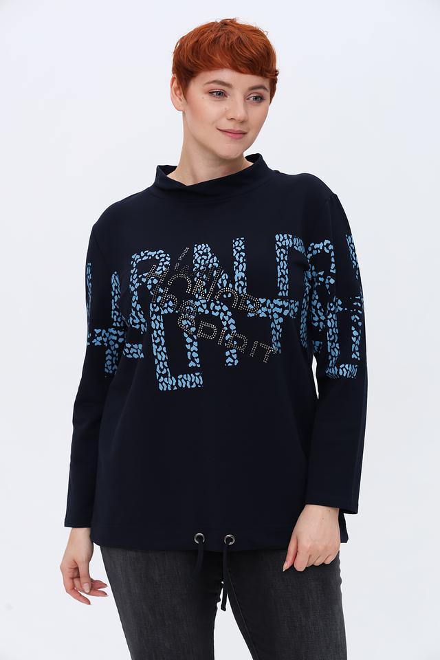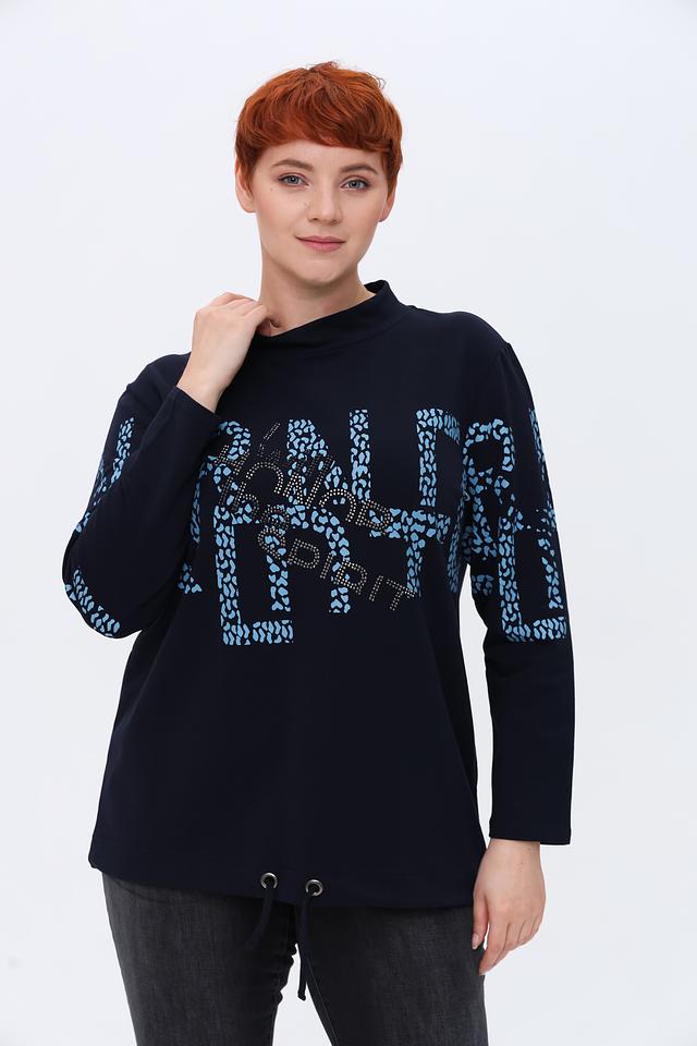 Стильный пуловер Doris Streich тёмно-синего цвета, украшенный оригинальным голубым декором с имитацией страз. Модель с удобным вырезом горловины и завязками по бокам для регулировки силуэта. Состав: хлопок 47%, модал 47%, эластан 6%