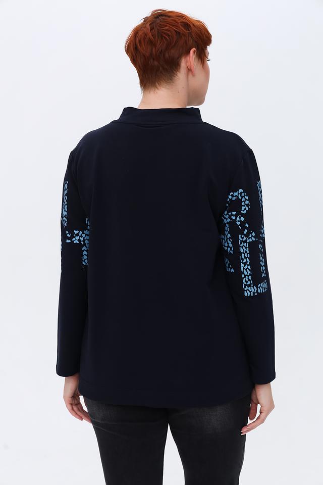 Основной цвет пуловера – тёмно-синий, который прекрасно сочетается с голубым декором, выполненным в виде абстрактного рисунка с имитацией страз. Вырез горловины – классический, неглубокий, что делает модель универсальной и подходящей для различных стилей.