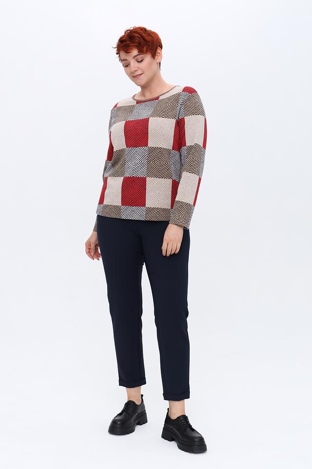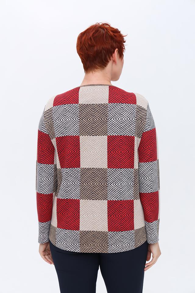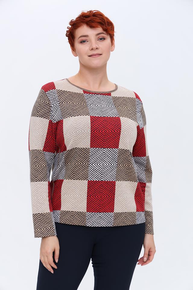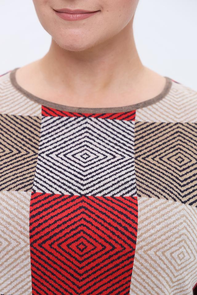 Пуловер имеет оригинальный дизайн с геометрическим принтом в виде ромбов, выполненным в красных, бежевых и серых тонах. Круглый вырез горловины и длинные рукава делают его универсальным для различных образов.