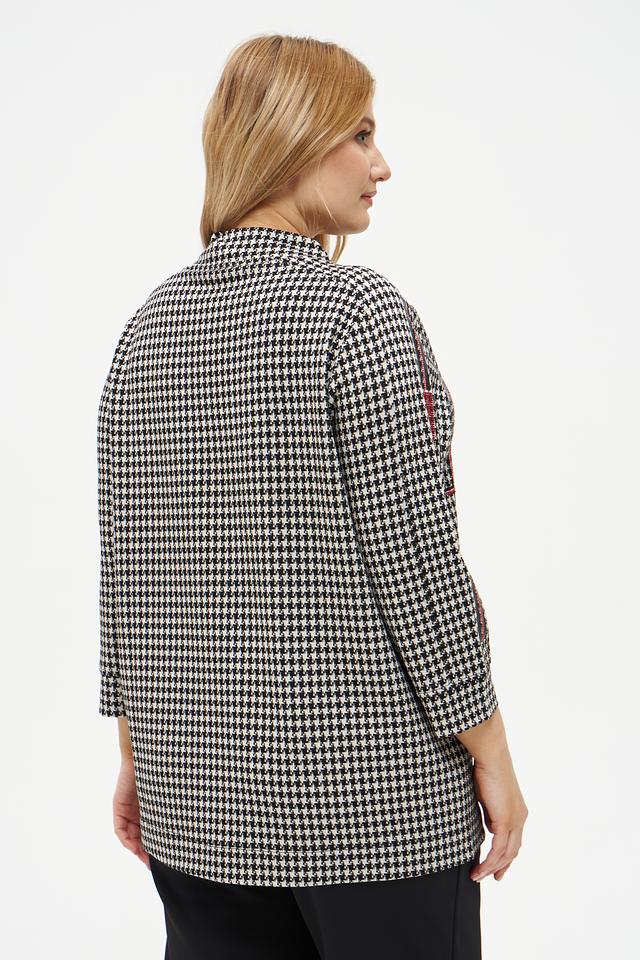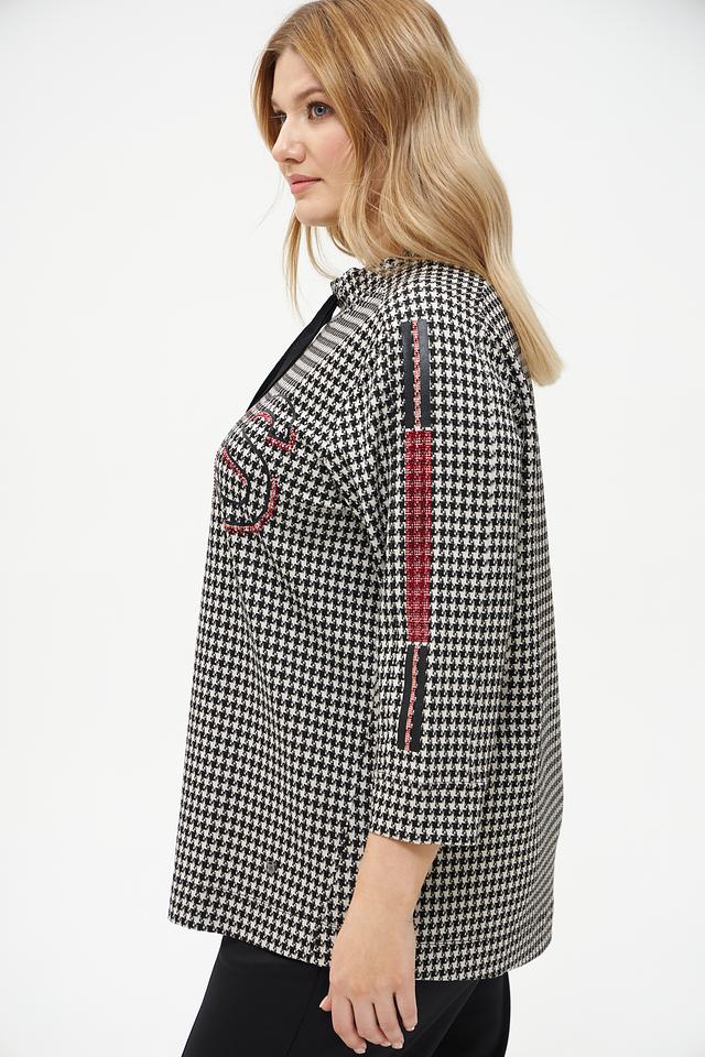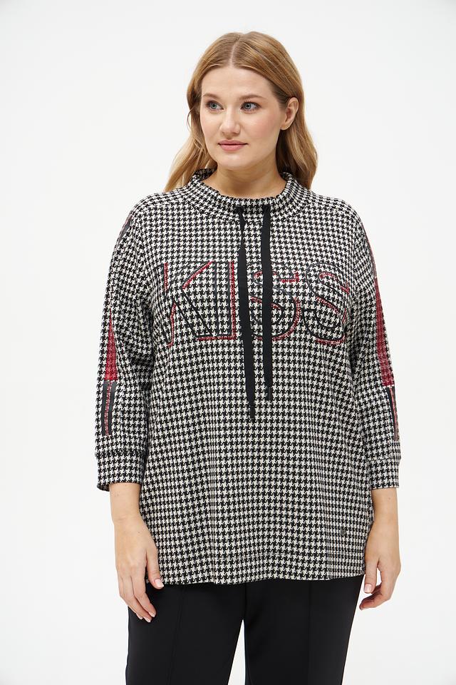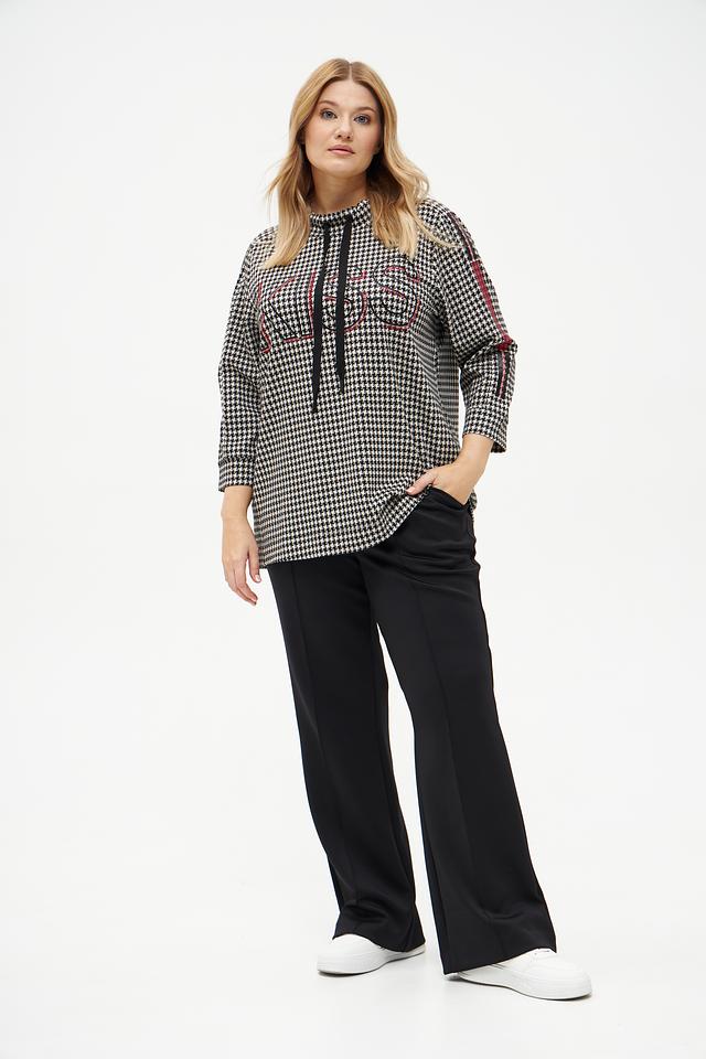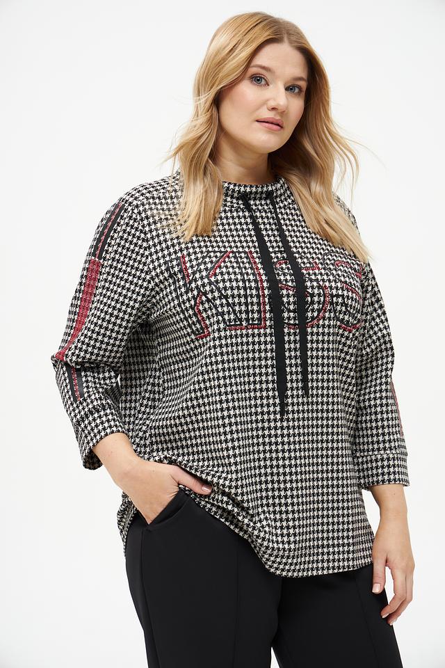 Женский пуловер Frapp чёрно-белого цвета с принтом "гусиная лапка" и декоративной лентой. Изготовлен из мягкой вискозы с добавлением полиамида и эластана для комфорта и хорошей посадки. Состав: вискоза 58%, полиамид 37%, эластан 5%