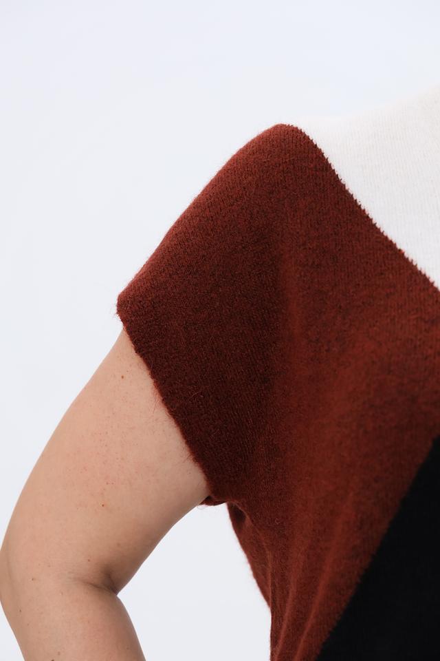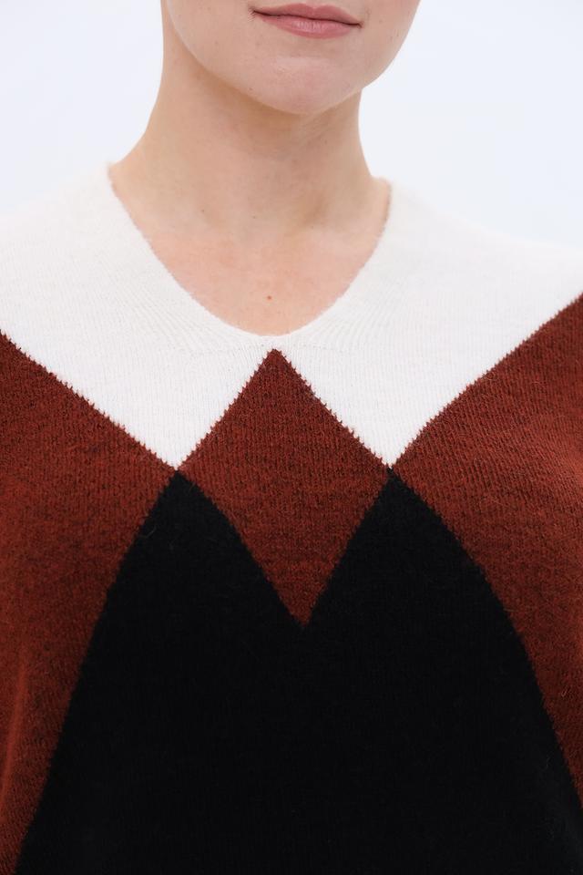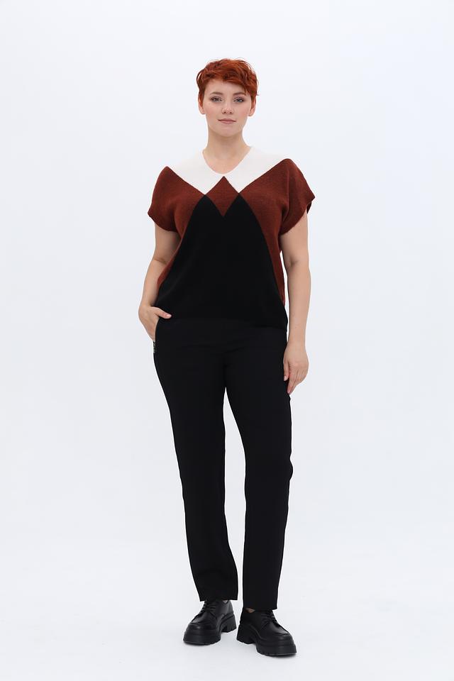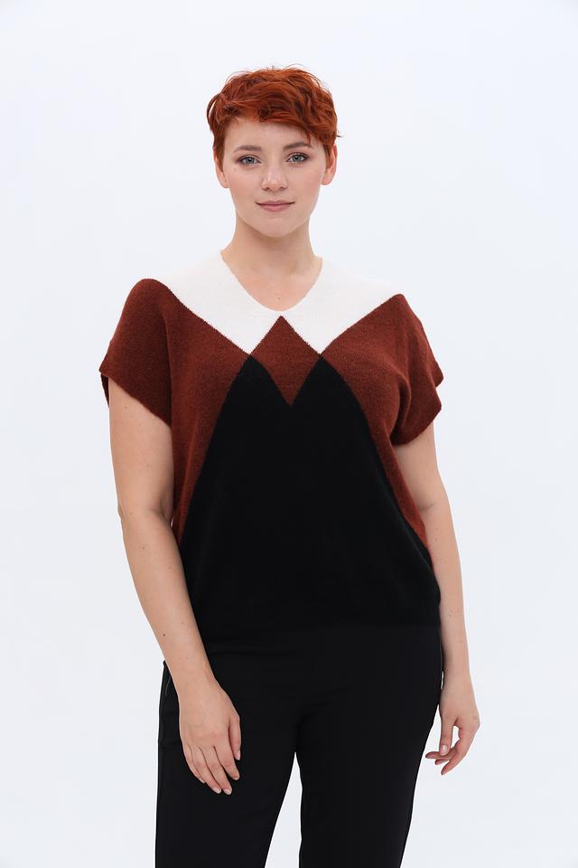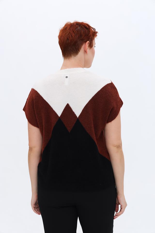 Женский пуловер Gerry Weber коричневого, черного и белого цвета с геометрическим узором. Модель без рукавов с V-образным вырезом, выполненная из мягкой пряжи с добавлением шерсти. Состав: полиамид 43%, полиакрил 39%, шерсть овечья 10%, шерсть альпаки 5%, эластан 3%