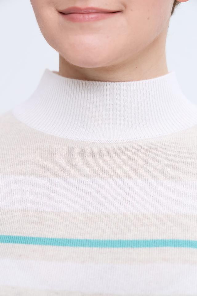 Этот пуловер от Gerry Weber станет прекрасным дополнением к вашему гардеробу. Модель выполнена в приятной цветовой гамме с сочетанием бежевого, белого и бирюзового цветов в полоску.