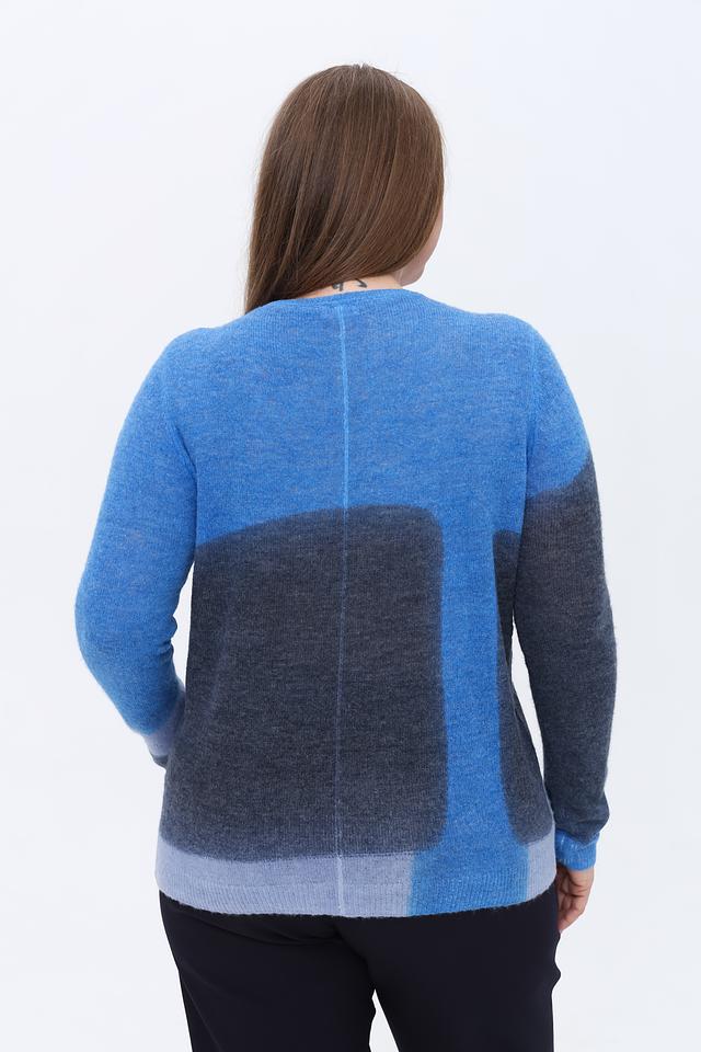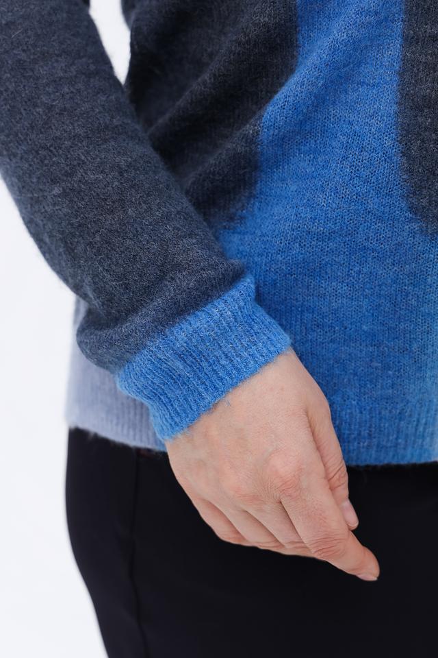 Пуловер имеет свободный крой, который обеспечивает свободу движений и позволяет создавать различные образы. Дизайн изделия выполнен в виде широких горизонтальных полос разных оттенков голубого и серого цветов, что придает ему современный и оригинальный вид.