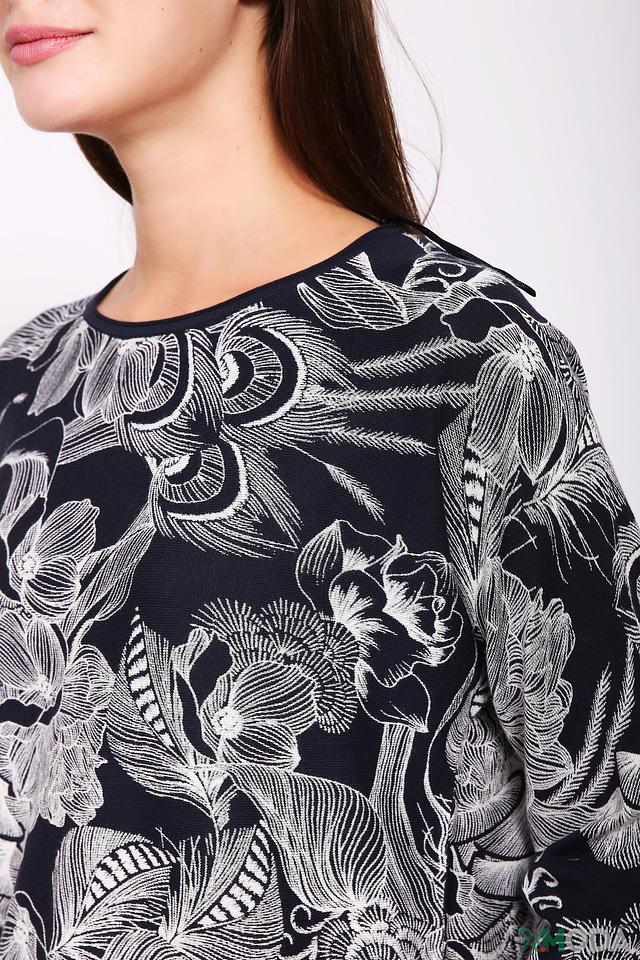 Пуловер имеет классический крой с круглым вырезом горловины и длинными рукавами. Его отличает яркий и запоминающийся принт с изображением цветов, выполненный в бело-серых тонах на тёмно-синем фоне.