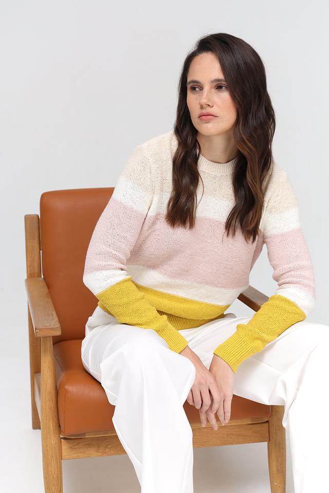 Женский пуловер Gerry Weber нежно-розового, белого и горчичного цвета с полосатым дизайном. Изготовлен из хлопка с добавлением полиэстера для комфорта и долговечности. Состав: хлопок 70%, полиэстер 30%