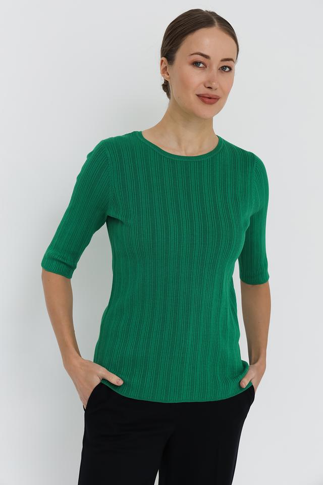 Модель имеет прямой крой, круглый вырез горловины и короткий рукав, что делает его идеальным для тёплой погоды или для ношения под жакет или кардиган. Текстура изделия выполнена в виде вертикальной рубрики, что придает ему особую изысканность.
