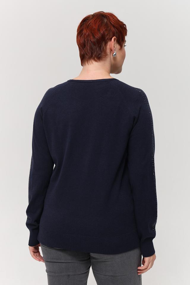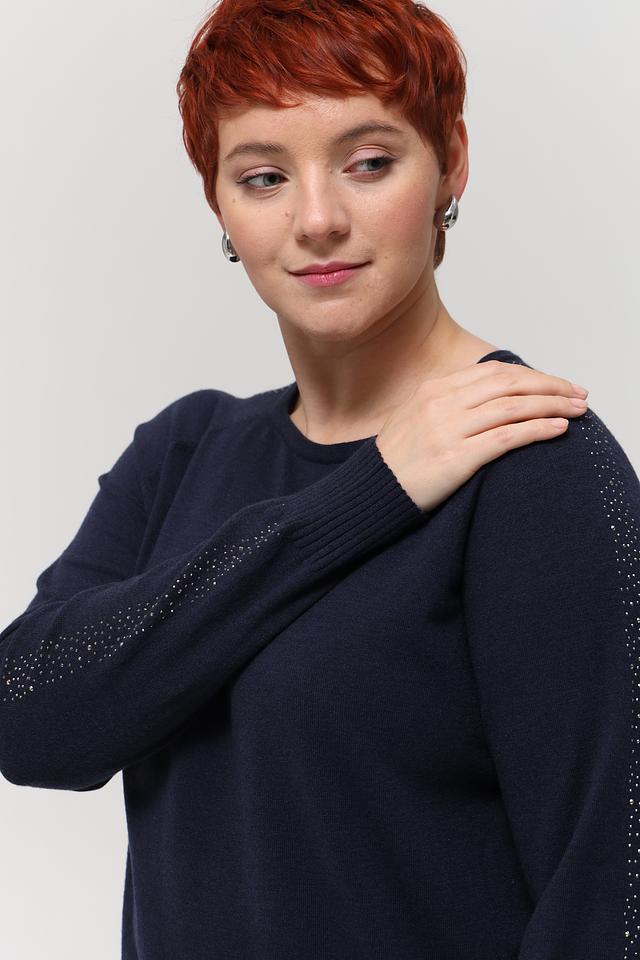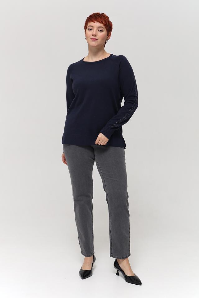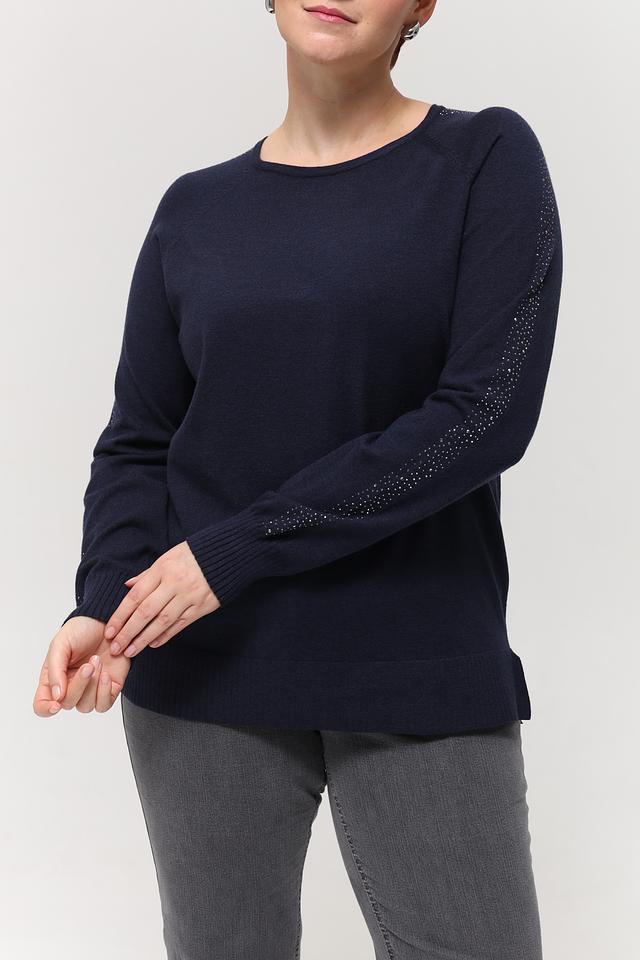 Пуловер имеет классический крой с круглым вырезом горловины и длинными рукавами. Особый акцент сделан на рукавах, которые украшены мерцающими пайетками, добавляющими образу изысканности и блеска.