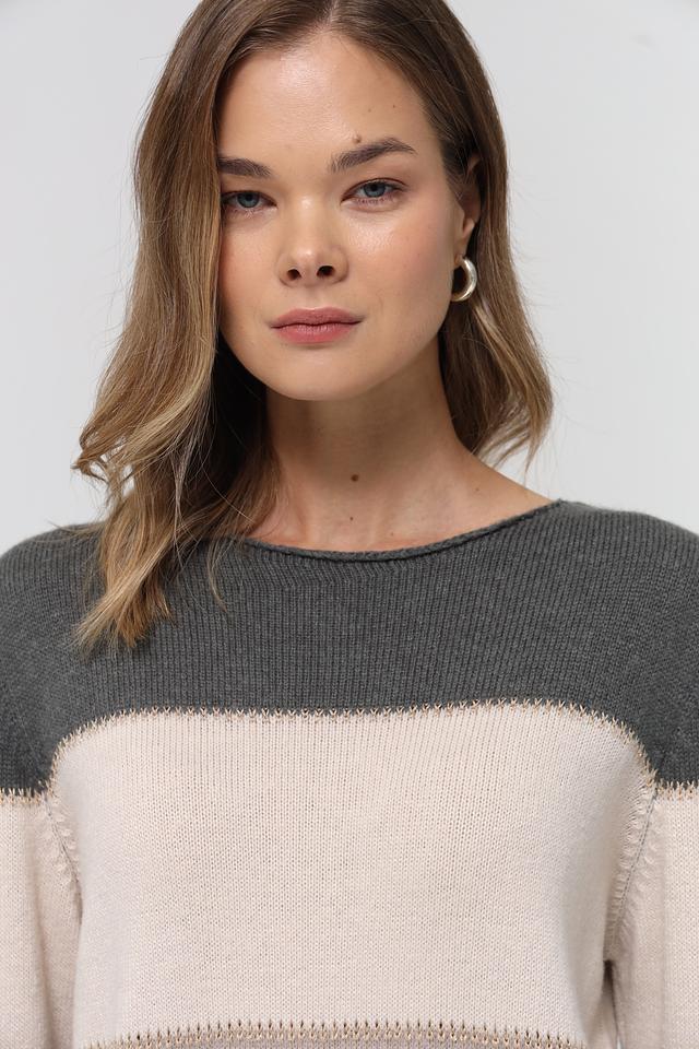 Этот пуловер от Lebek станет отличным дополнением к вашему образу. Он выполнен в бежевой цветовой гамме с горизонтальными полосами, что придает ему современный и стильный вид.