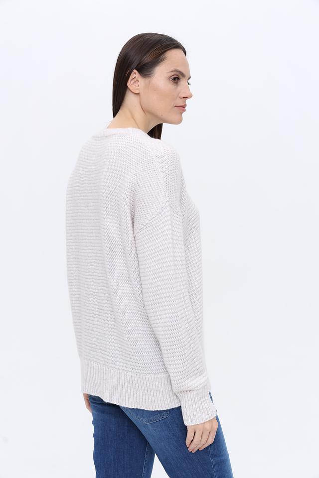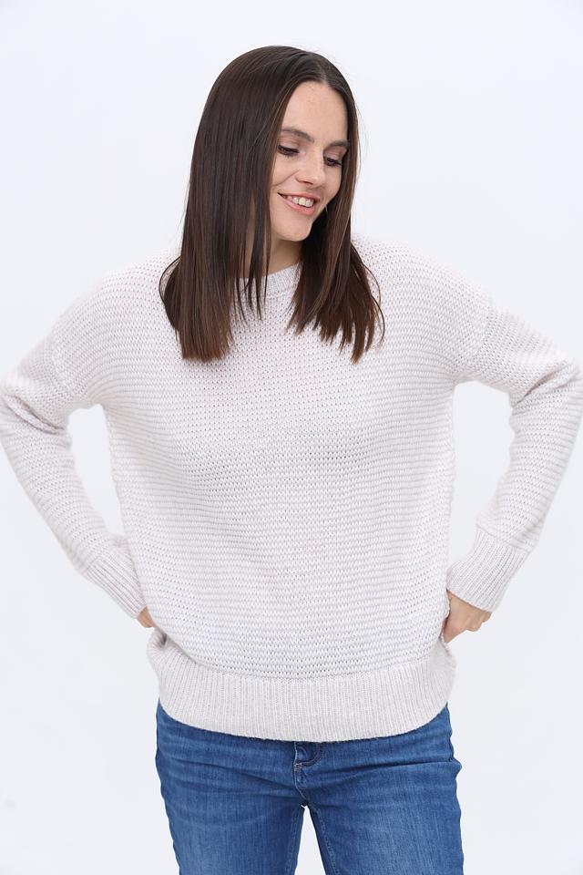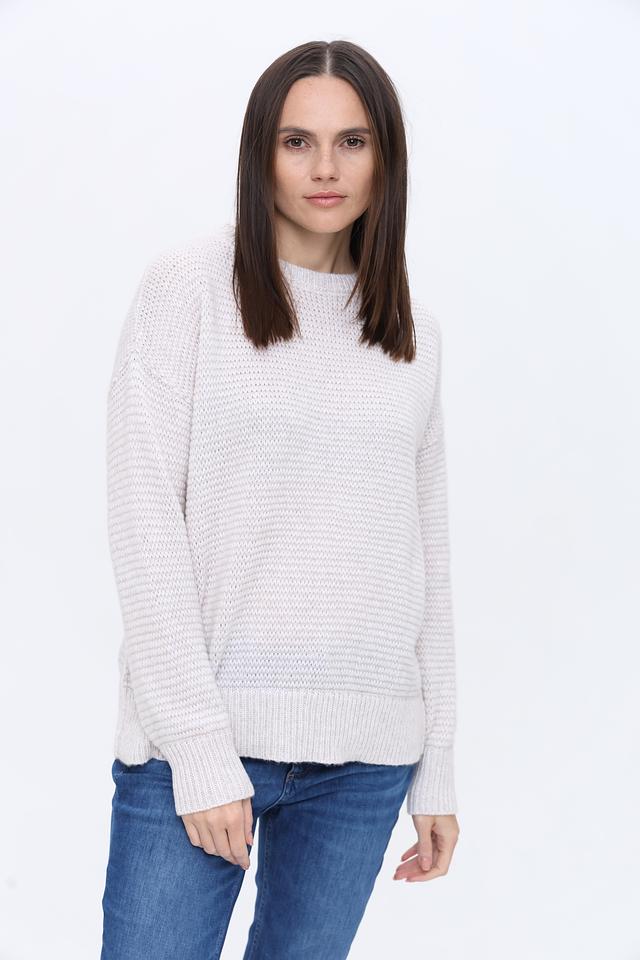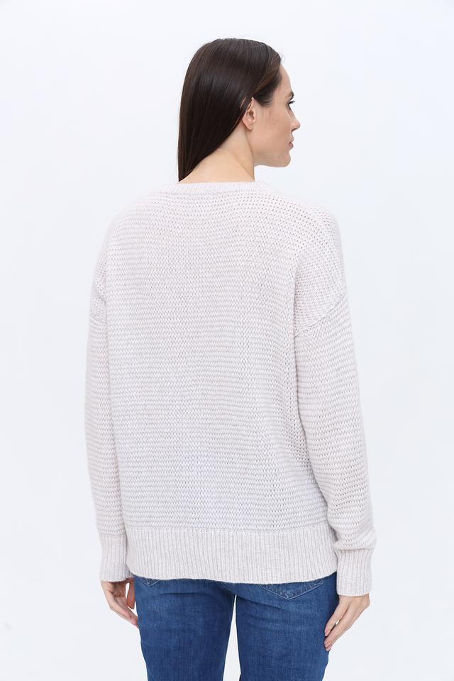 Пуловер имеет свободный крой, который не сковывает движений и позволяет создать расслабленный образ. Округлый вырез горловины делает модель универсальной и подходящей для различных типов внешности. Текстурная вязка добавляет изделию объём и оригинальность.