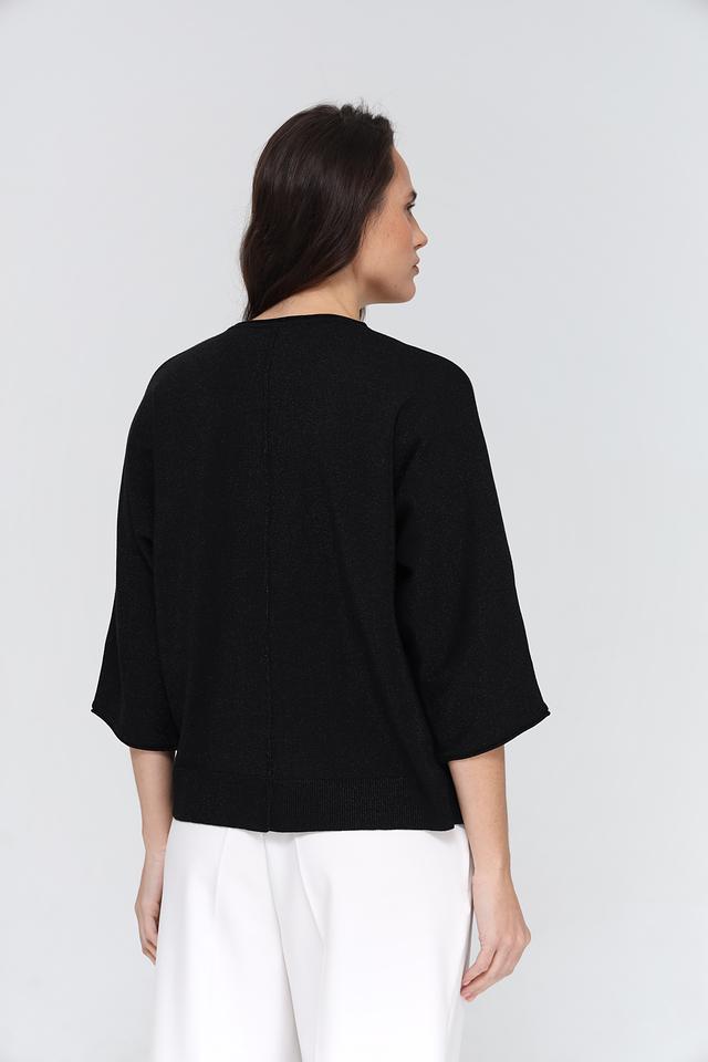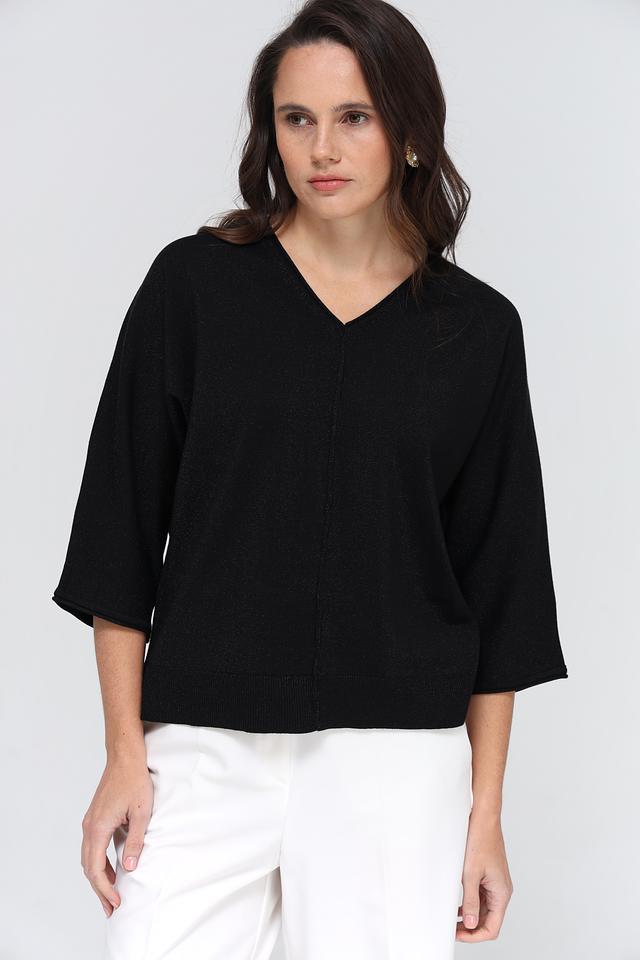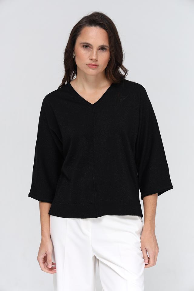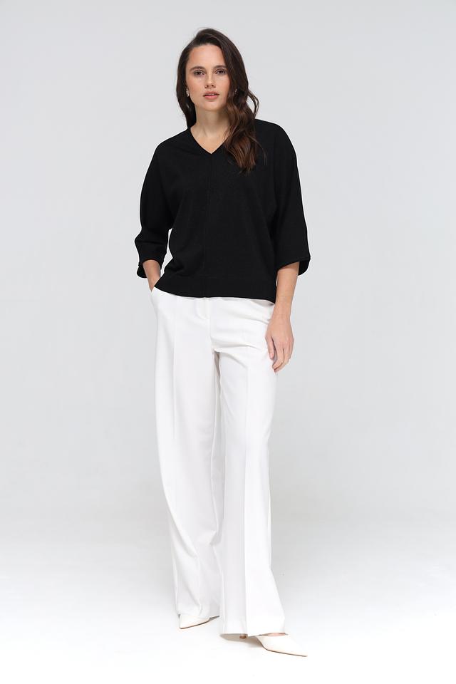 Пуловер имеет V-образный вырез, который визуально удлиняет шею и делает силуэт более изящным. Рукава длиной 3/4 добавляют образу лёгкости и непринуждённости. Ткань пуловера приятна на ощупь и обеспечивает комфорт в носке.