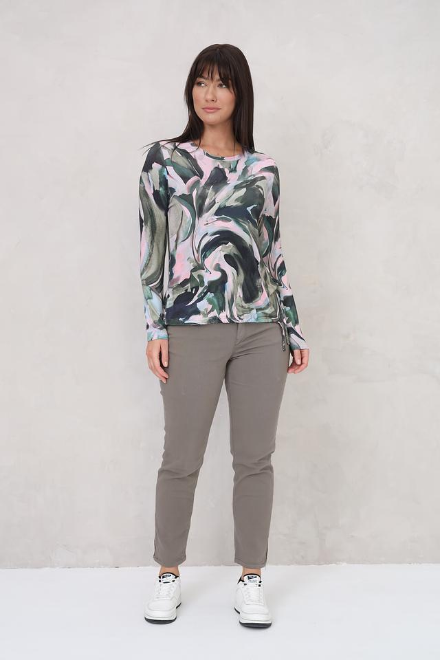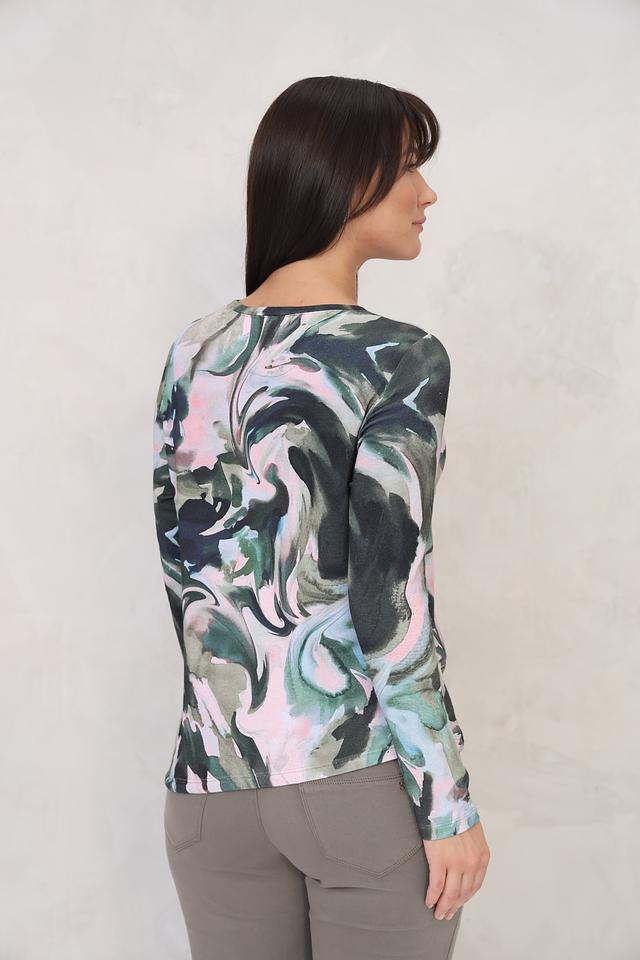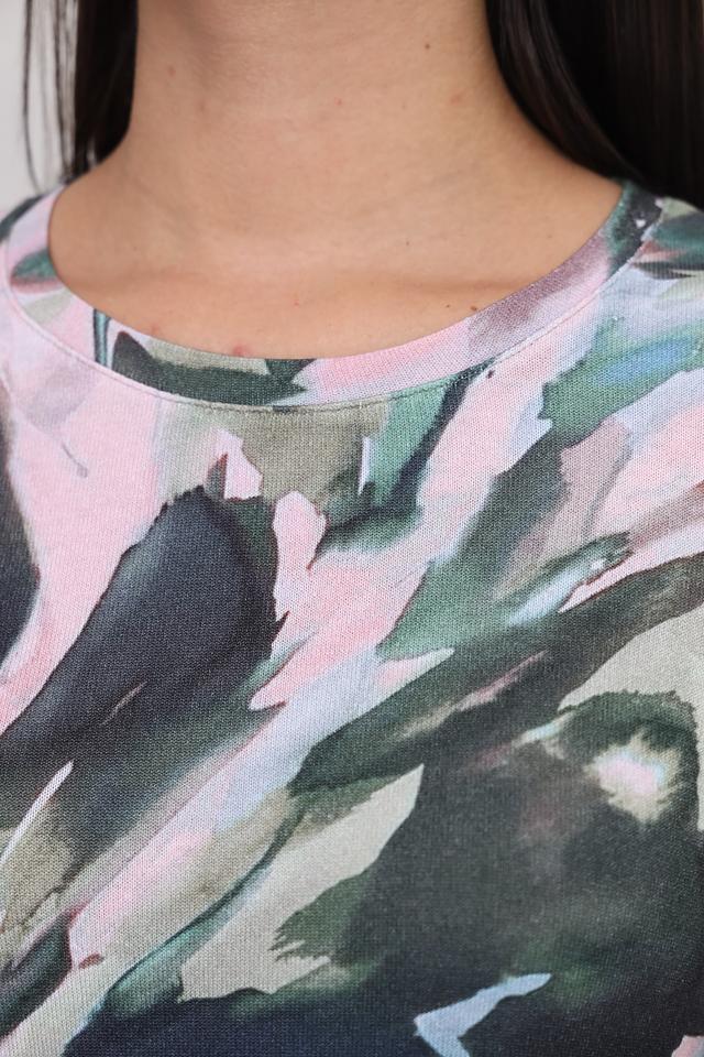 Особенностью модели является яркий абстрактный принт, сочетающий в себе оттенки зелёного, розового и белого. Круглый вырез горловины и длинные рукава делают этот пуловер универсальным для любого времени года.