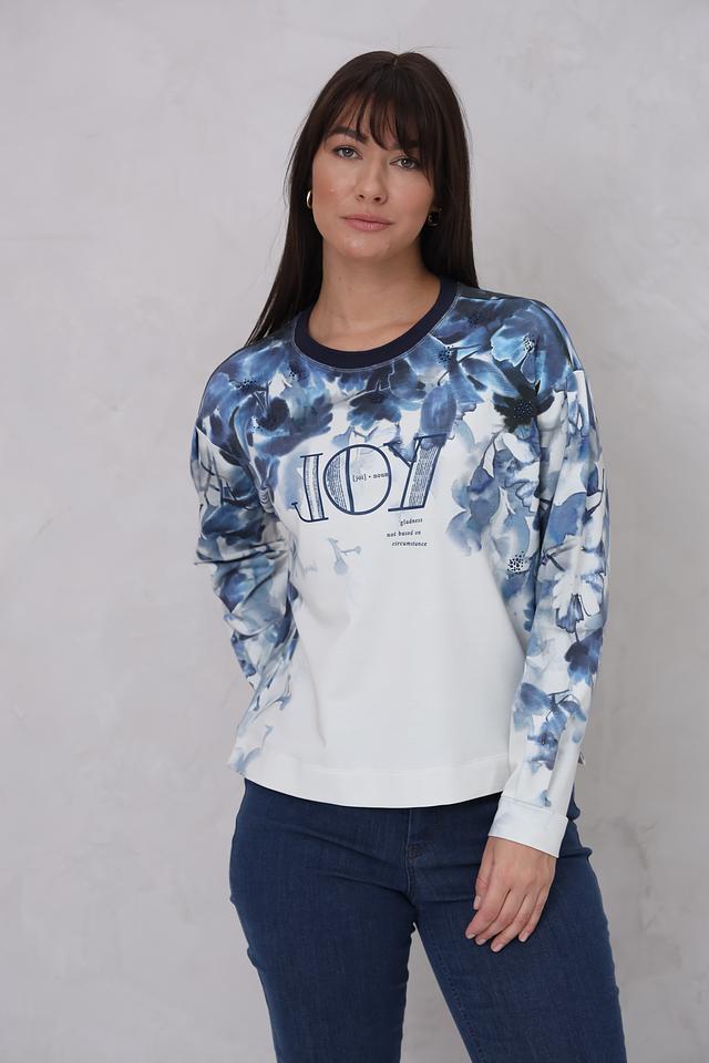 Женский пуловер Lecomte белого цвета с ярким цветочным принтом и надписью "JOY". Модель выполнена из мягкого и приятного к телу сочетания хлопка, модала и эластана, обеспечивающего комфорт при носке. Состав: хлопок 47%, модал 47%, эластан 6%