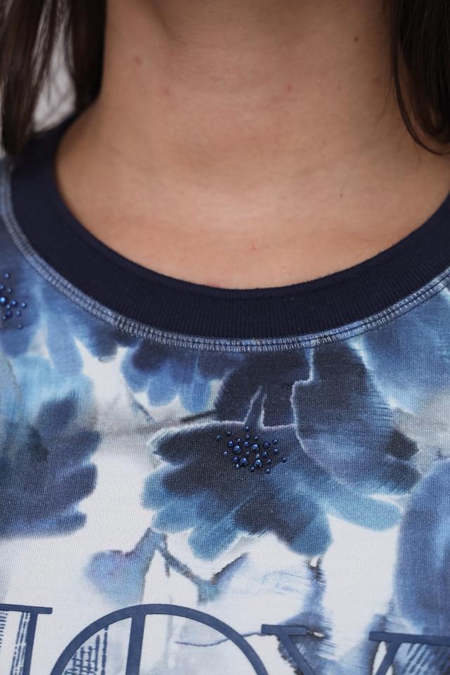 Этот стильный пуловер от Lecomte станет прекрасным дополнением к вашему гардеробу. Пуловер выполнен в белом цвете и украшен эффектным цветочным принтом в синих тонах. Надпись "JOY" добавляет образу позитива и оригинальности.
