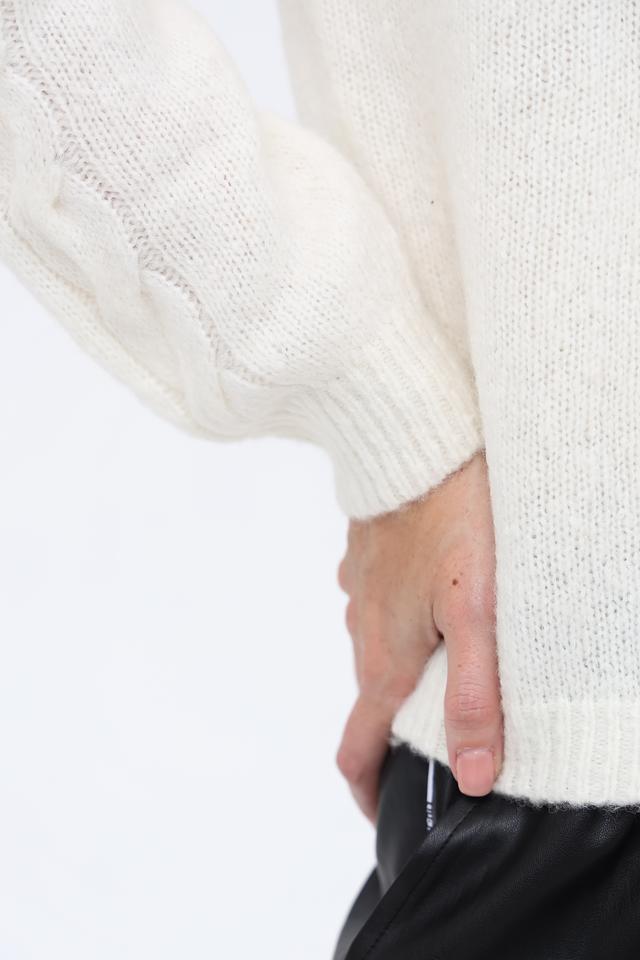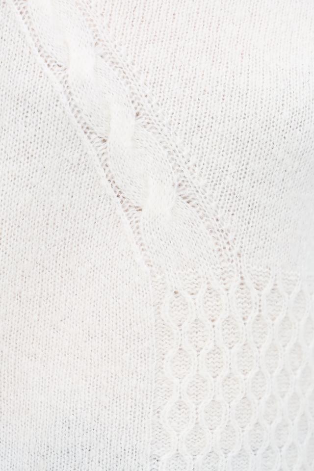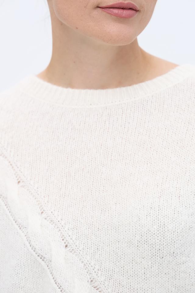 Пуловер имеет классический крой и округлый вырез горловины. Особый шарм изделию придаёт узор из кос, который добавляет текстуру и визуальный интерес. Молочный цвет пуловера универсален и легко сочетается с различными элементами одежды.