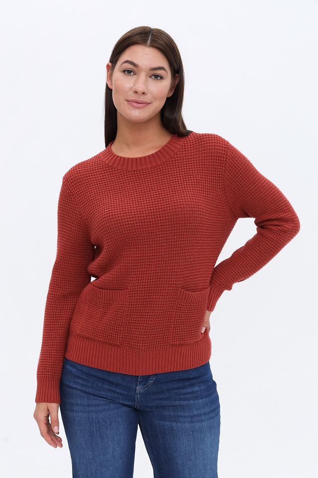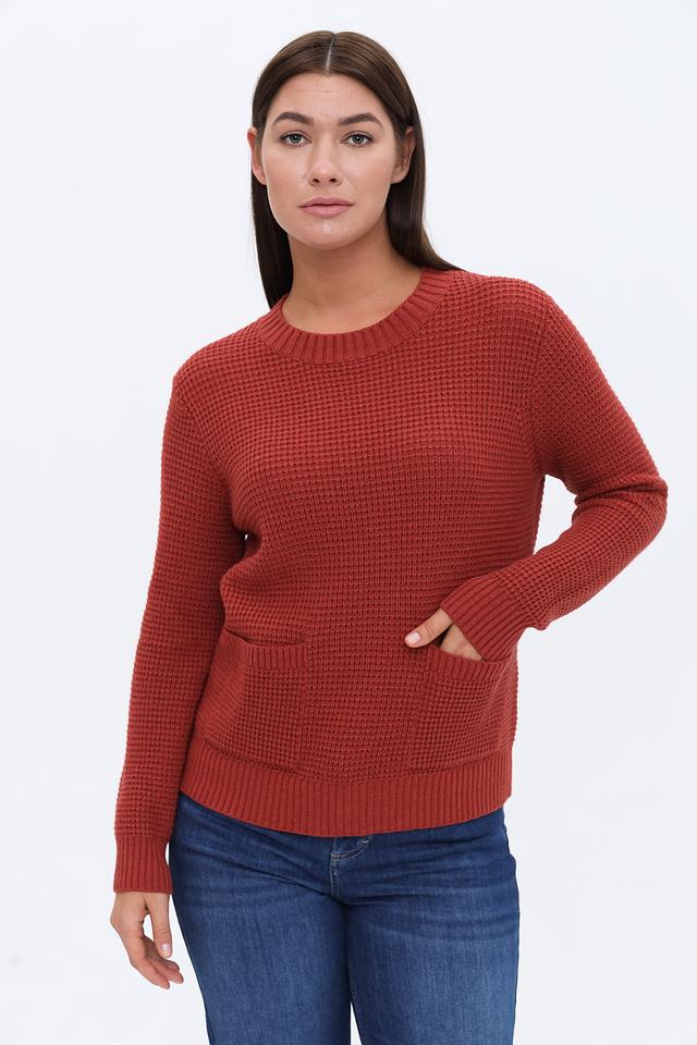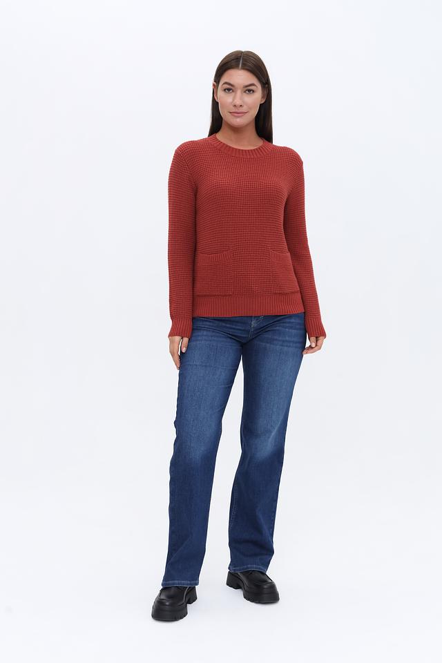 Женский пуловер Maerz терракотового цвета с округлым вырезом и накладными карманами. Изготовлен из мягкой смеси шерсти, вискозы, полиамида и кашемира, обеспечивающей комфорт и тепло. Состав: полиамид 35%, шерсть 30%, вискоза 30%, кашемир 5%