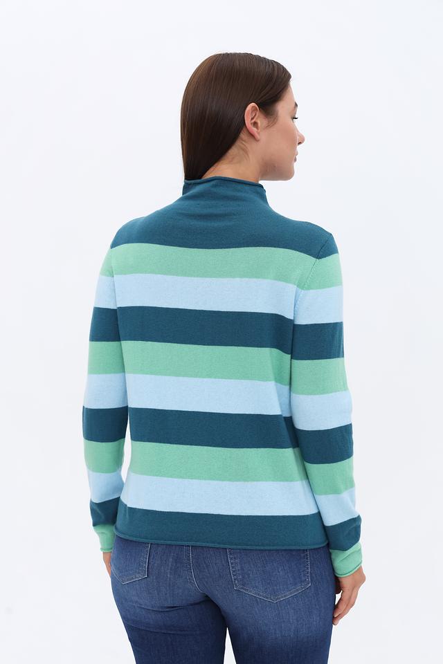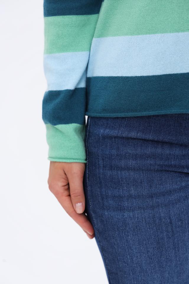 Этот стильный пуловер от бренда Maerz выполнен в полоску, сочетающую различные оттенки бирюзового и зелёного. Изделие имеет удобный вырез горловины, который не стесняет движений и придает образу элегантность.