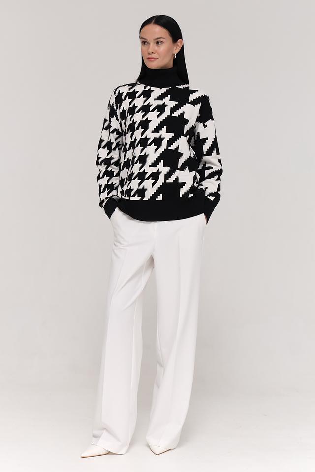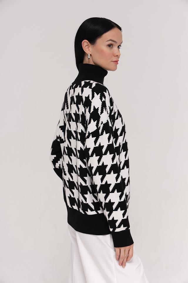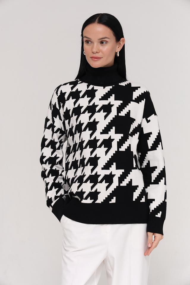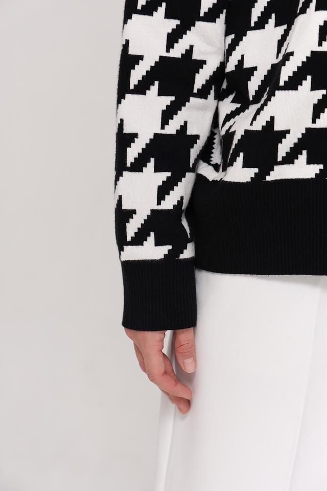 Стильный пуловер Marc Aurel чёрно-белого цвета с геометрическим принтом "гусиная лапка". Изготовлен из мягкой и приятной к телу смеси вискозы, полиэстера и полиамида. Состав: вискоза 50%, полиэстер 28%, полиамид 22%