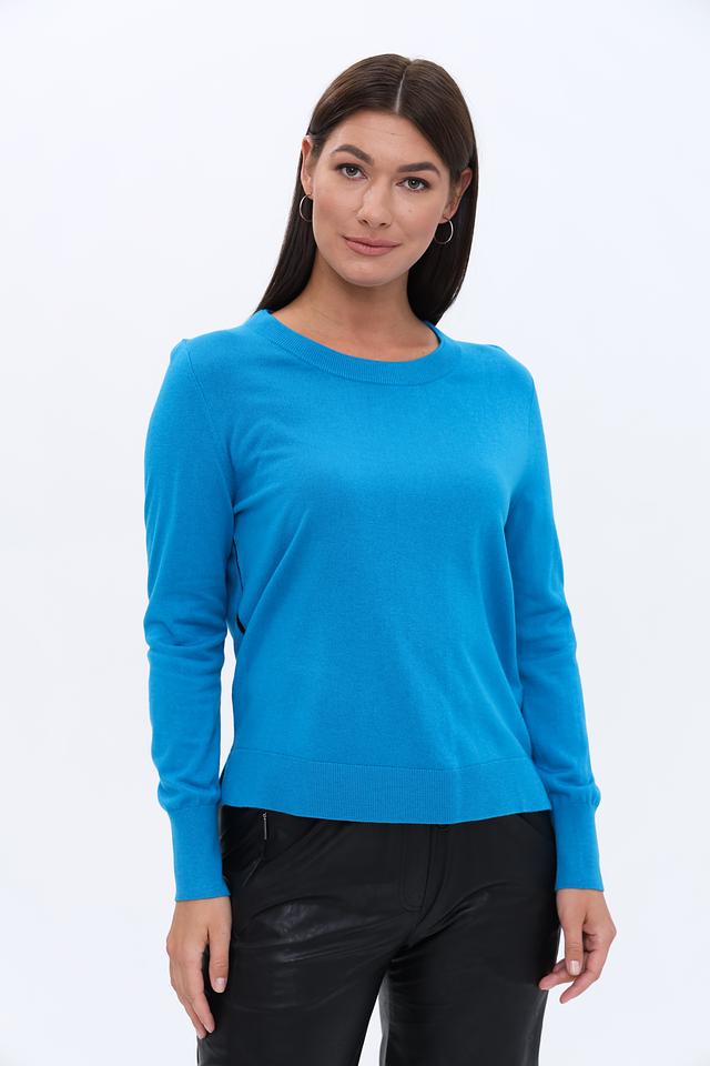 Яркий бирюзовый цвет пуловера добавит свежести и оригинальности вашему образу. Текстура вязки приятна на ощупь и не сковывает движений. Этот пуловер станет незаменимой вещью в вашем гардеробе в прохладное время года.