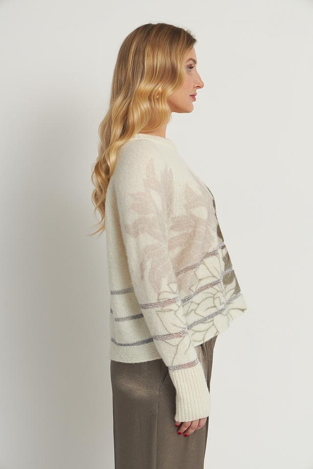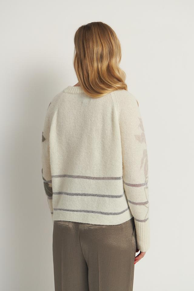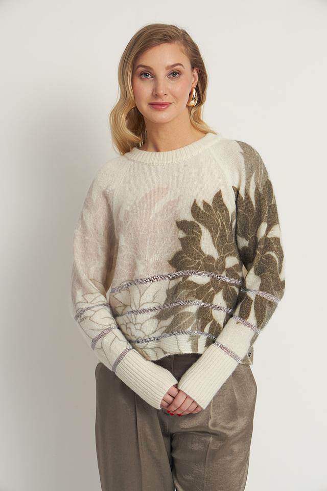 Элегантный пуловер Marc Cain кремового цвета с оригинальным цветочным принтом. Изготовлен из мягкой смеси альпаки, полиамида, шерсти и хлопка, обеспечивающей комфорт и тепло. Состав: альпака 52%, полиамид 33%, шерсть 9%, хлопок 4%, металлизир. волокно 2%