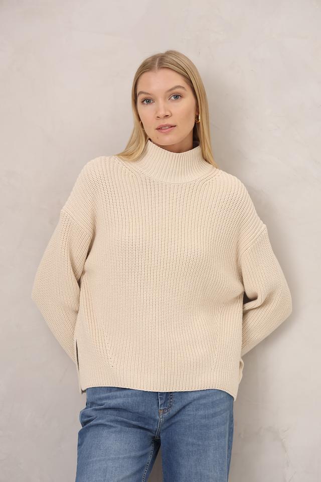 Пуловер имеет свободный крой, который не сковывает движения и создает расслабленный образ. Высокий воротник добавляет элегантности и защищает от холода. Текстура крупной вязки придает изделию объем и визуальный интерес.