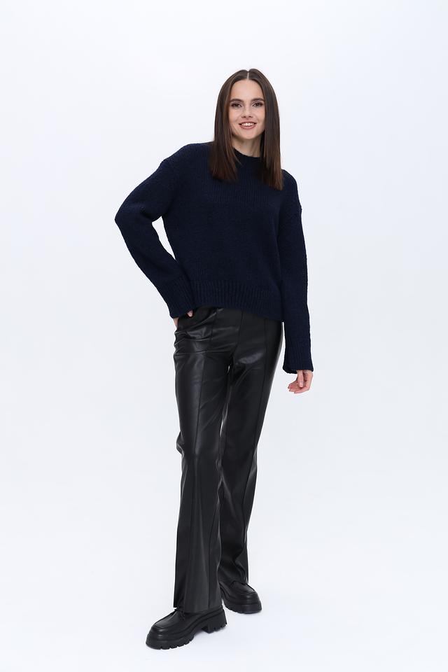 Пуловер имеет классический тёмно-синий цвет, который легко сочетается с различными элементами гардероба. Свободный крой не сковывает движений, а круглый вырез горловины придает образу непринужденность.