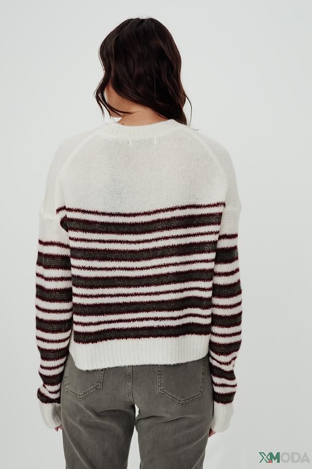 Этот стильный пуловер от Marc O Polo выполнен в белом цвете и украшен ярким полосатым узором в бордовых и серых тонах. Модель имеет классический крой с круглым вырезом горловины и длинными рукавами.