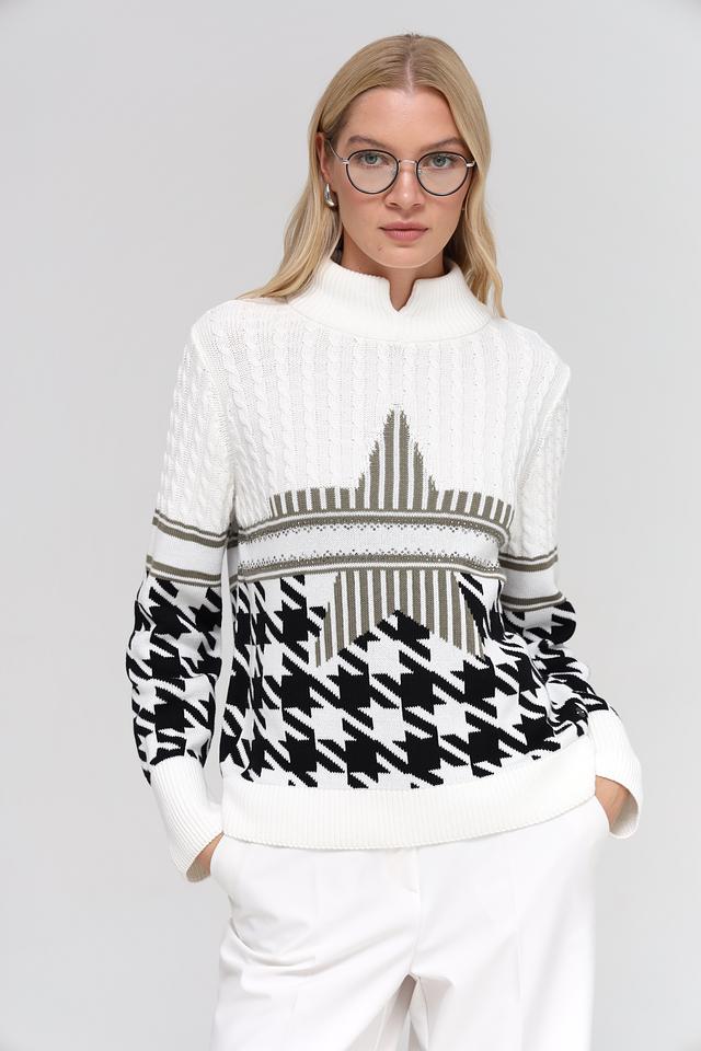 Белый пуловер Monari с оригинальным дизайном в клетку "гусиная лапка" и геометрическим узором станет стильным дополнением к вашему гардеробу. Изготовлен из 100% хлопка, обеспечивая комфорт и удобство в носке. Состав: хлопок 100%
