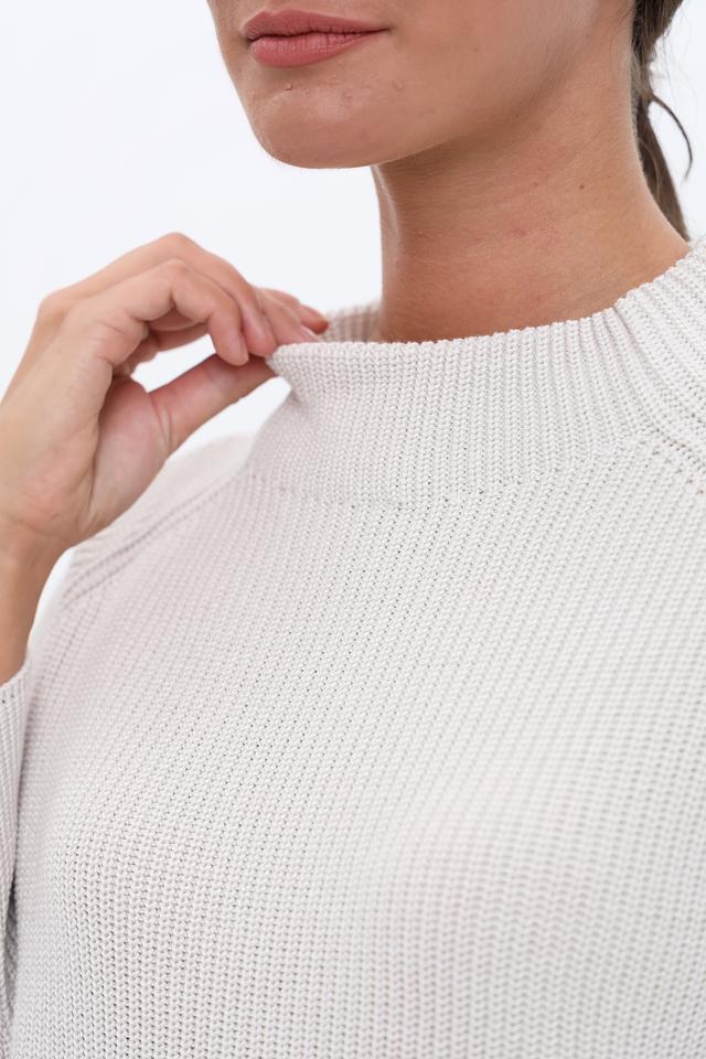 Пуловер имеет свободный крой, который обеспечивает комфорт в носке. Округлый вырез горловины и рукав три четверти придают модели элегантный и современный вид. Текстура вязки добавляет изделию объём и визуальный интерес.