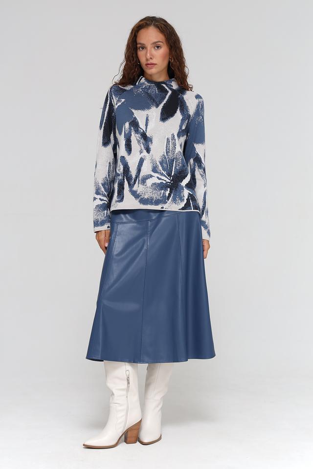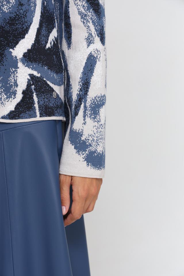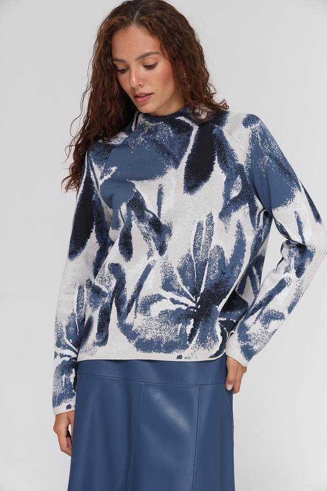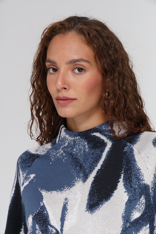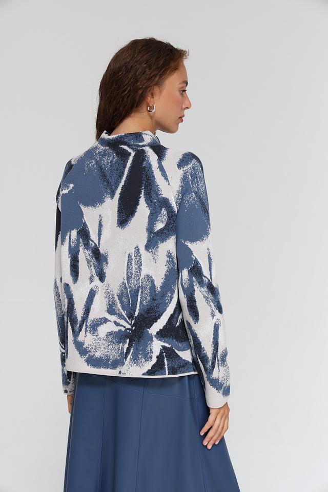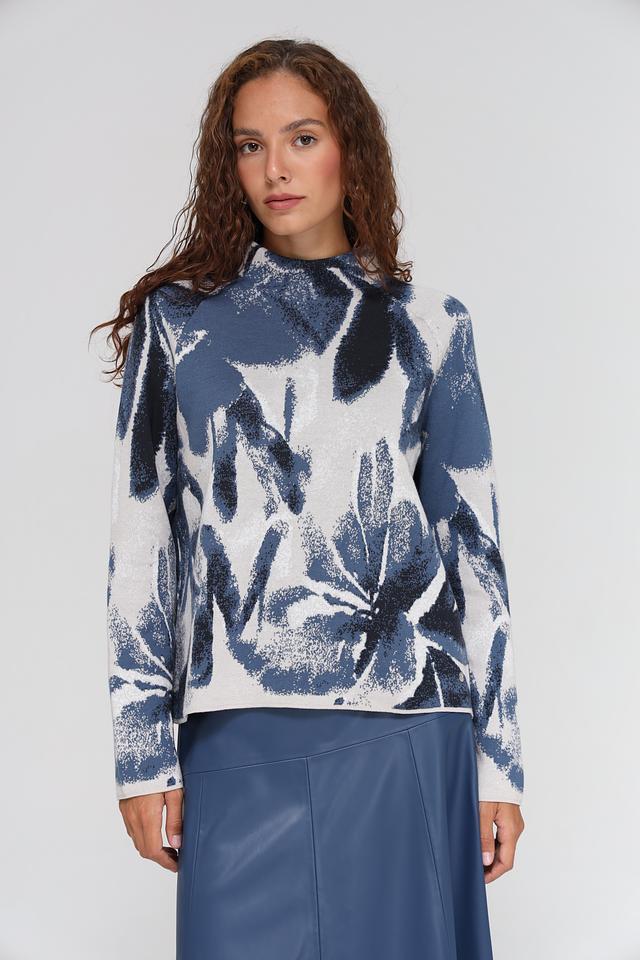 Дизайн пуловера отличается оригинальным цветочным принтом в синих и серых тонах. Высокий воротник добавляет элегантности и позволяет создавать разнообразные комбинации с другими элементами гардероба.