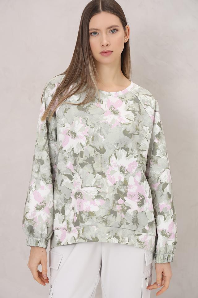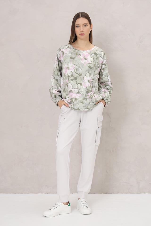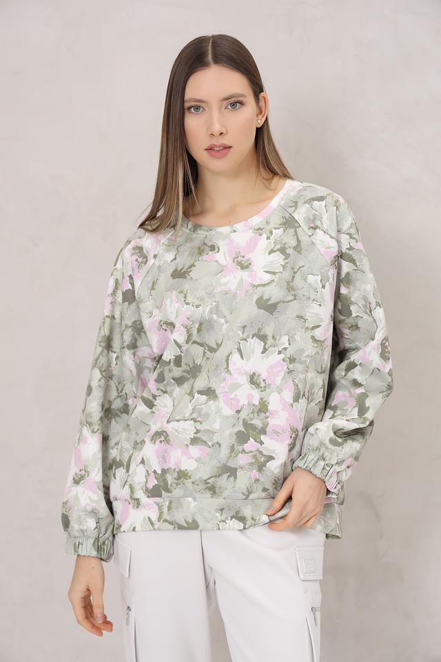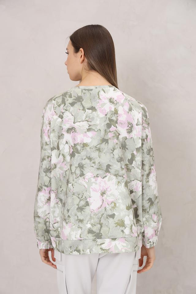 Особенностью данной модели является яркий цветочный принт, выполненный в нежных оттенках зелёного, розового и белого. Этот принт делает пуловер особенно женственным и привлекательным. Состав: 96% полиэстер, 4% эластан.
