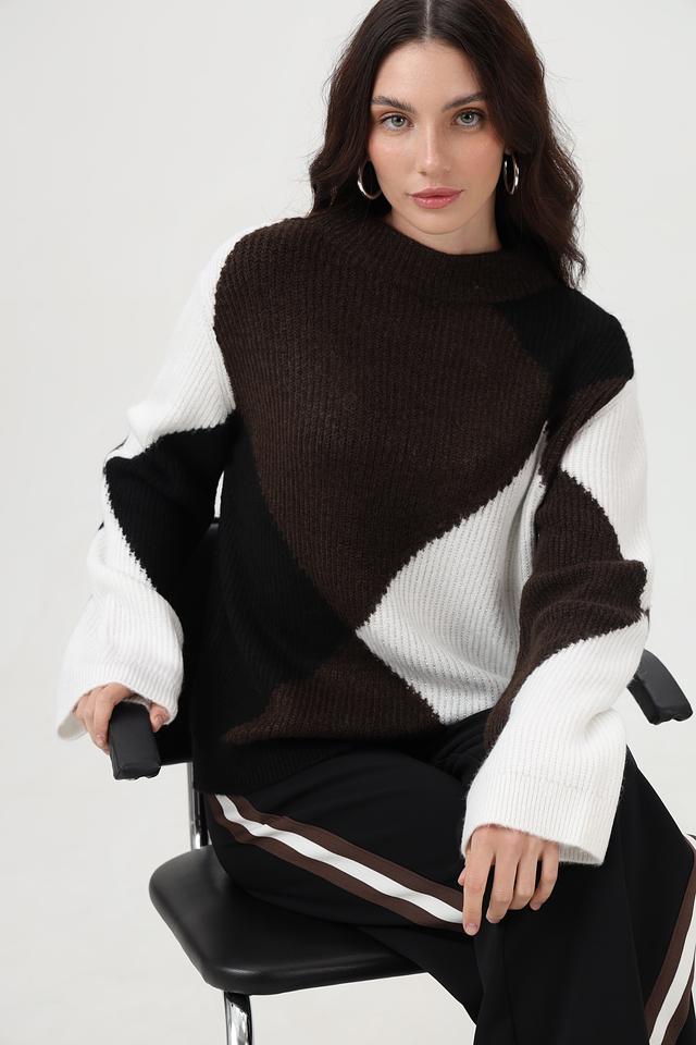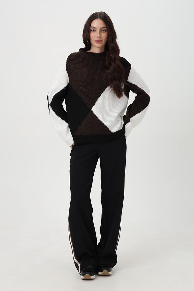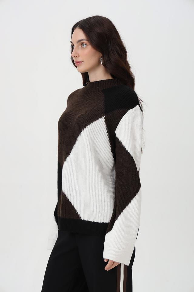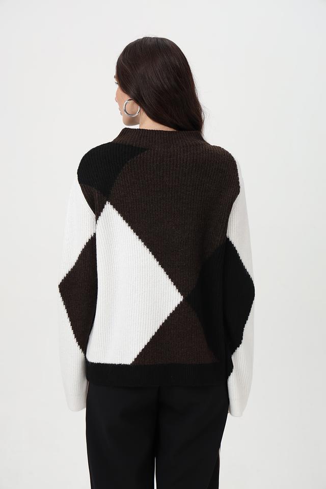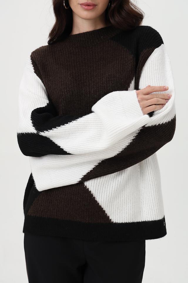 Представляем элегантный пуловер от бренда Monari, выполненный в сочетании коричневого, белого и чёрного цветов. Эта модель с оригинальным геометрическим узором, состоящим из крупных ромбов, станет ярким акцентом в вашем образе.
