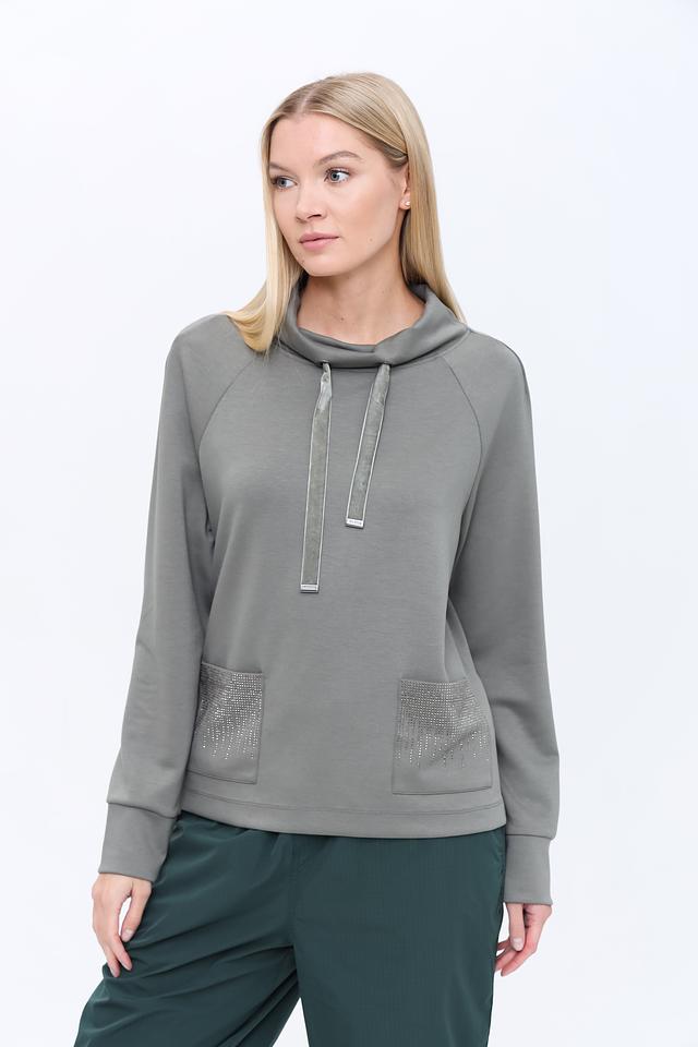 Серый пуловер Monari с декоративными карманами и оригинальным дизайном воротника. Изготовлен из мягкого и приятного к телу сочетания полиэстера, вискозы и эластана, обеспечивающего комфорт и свободу движений. Состав: полиэстер 55%, вискоза 38%, эластан 7%