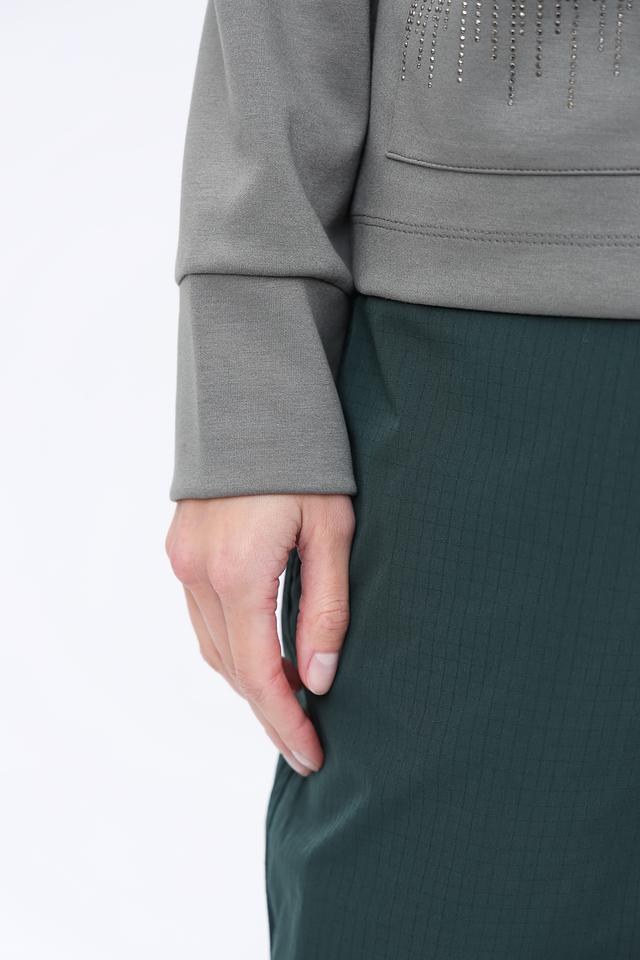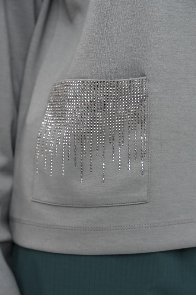 Пуловер имеет удобный крой и приятную на ощупь текстуру благодаря составу: 55% полиэстер, 38% вискоза и 7% эластан. Декоративные карманы, украшенные стразами, придают модели изысканность и индивидуальность.