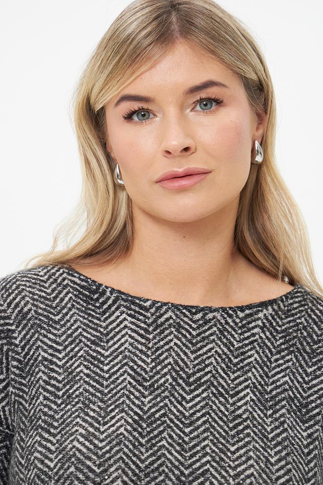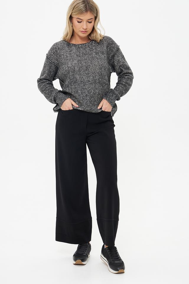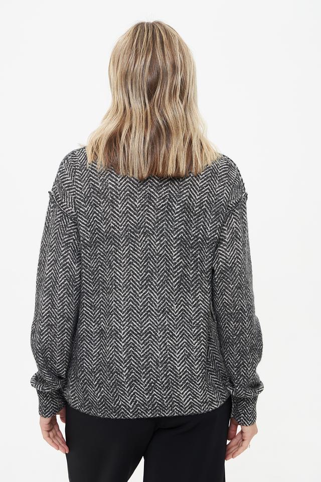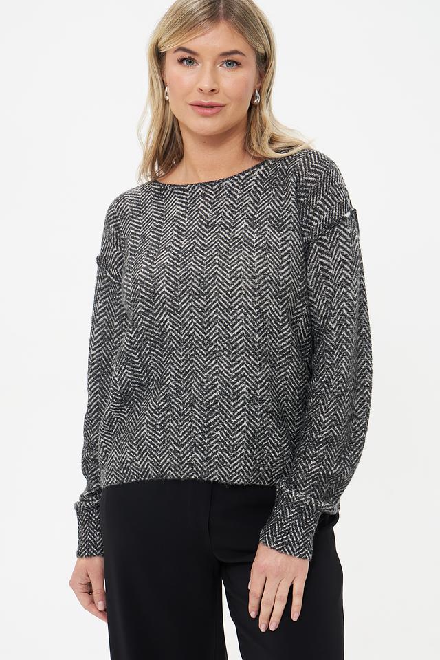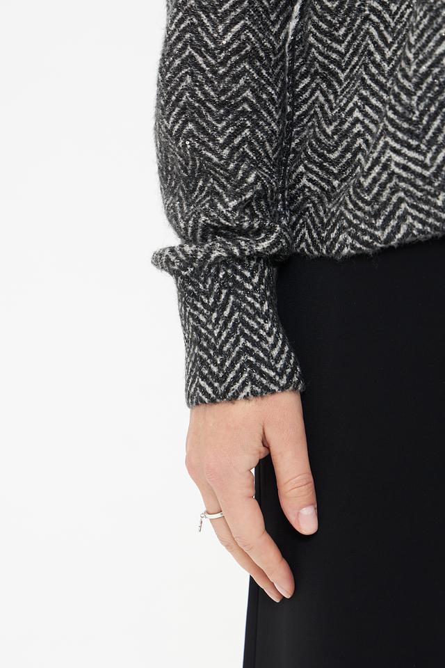Пуловер имеет классический крой с длинными рукавами и круглым вырезом горловины. Его особенностью является оригинальный узор в виде "ёлочки", выполненный в контрастных чёрно-белых тонах. Этот принт добавляет изделию динамичности и делает его интересным акцентом в вашем образе.