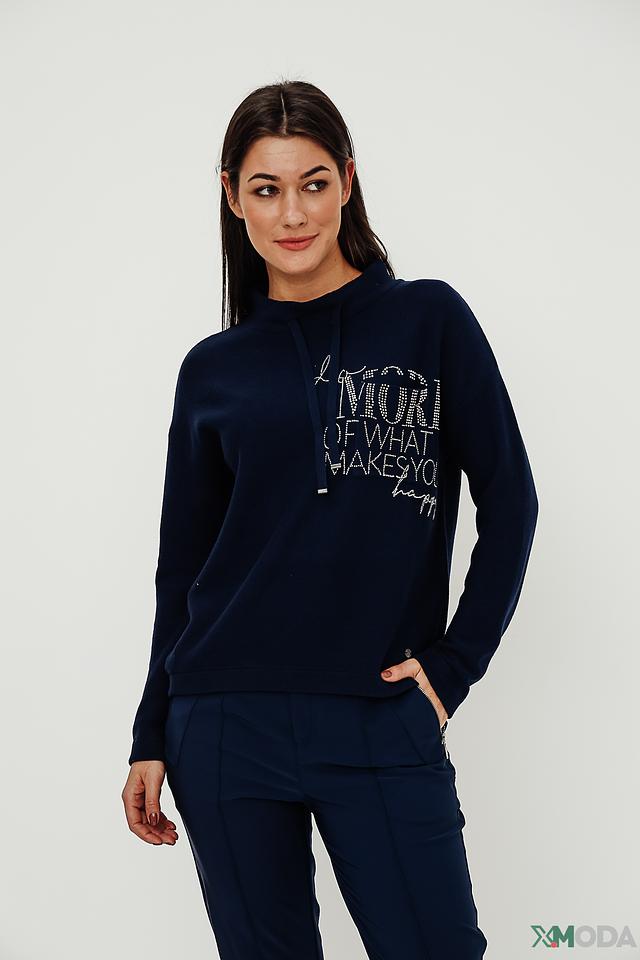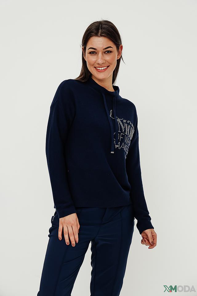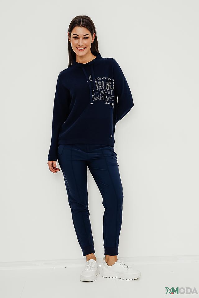 Синий пуловер от Monari с оригинальным дизайном и капюшоном. Модель выполнена из мягкого хлопка и украшена вышивкой с логотипом бренда. Идеальный выбор для создания комфортного и стильного образа. Состав: хлопок 100%