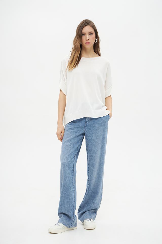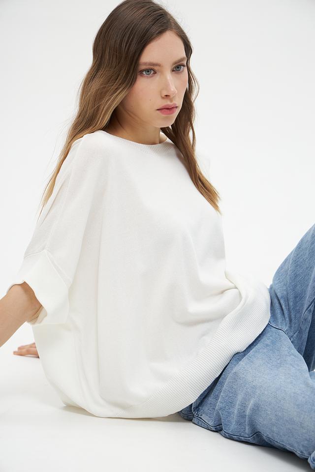 Модель имеет свободный крой, который обеспечивает комфорт в носке. Рукав 3/4 добавляет образу лёгкости и непринуждённости. Округлый вырез горловины делает пуловер универсальным и подходящим для разных случаев.