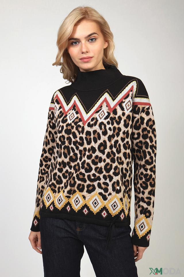 Женский пуловер Oui черного цвета с ярким леопардовым узором и геометрическим орнаментом. Модель выполнена из мягкого хлопка, обеспечивающего комфорт в носке. Высокий воротник добавляет элегантности. Состав: хлопок 100%