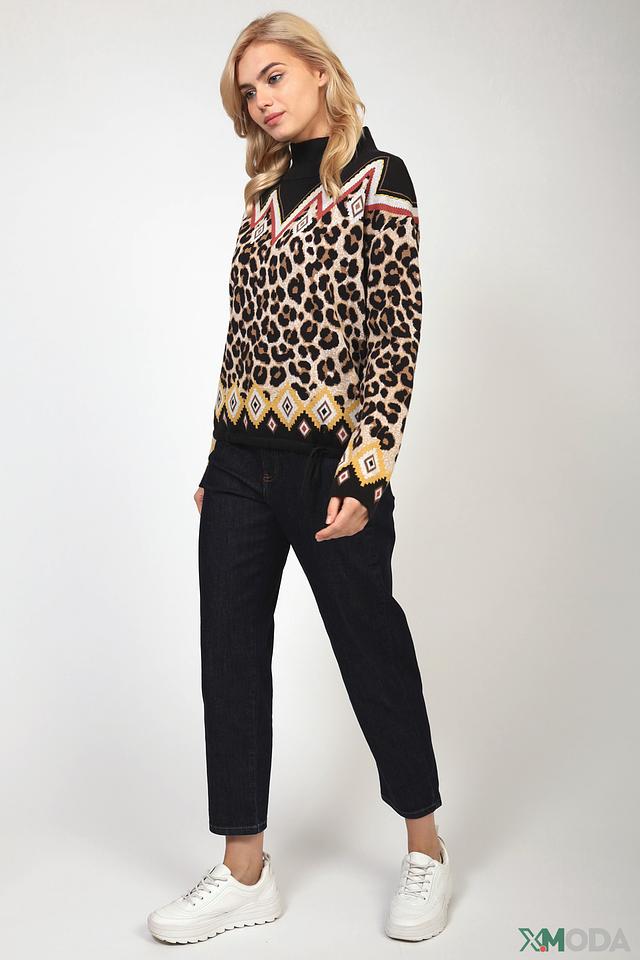Дизайн пуловера сочетает в себе смелость и элегантность, делая его подходящим как для повседневной носки, так и для особых случаев. Сочетание черного, бежевого и коричневого цветов в леопардовом принте создает динамичный и запоминающийся образ. Декоративные элементы в виде ромбов добавляют оригинальности.