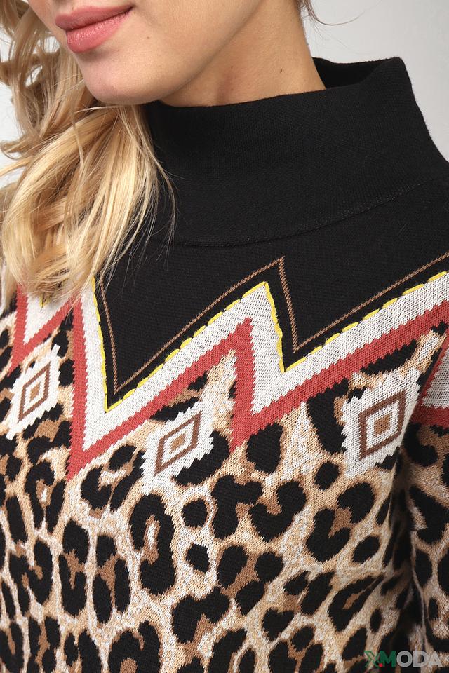 Пуловер имеет классический крой с высоким воротником, который подчеркивает изящность силуэта. Основной цвет – черный, который служит идеальным фоном для эффектного леопардового узора и геометрического орнамента в верхней части изделия.