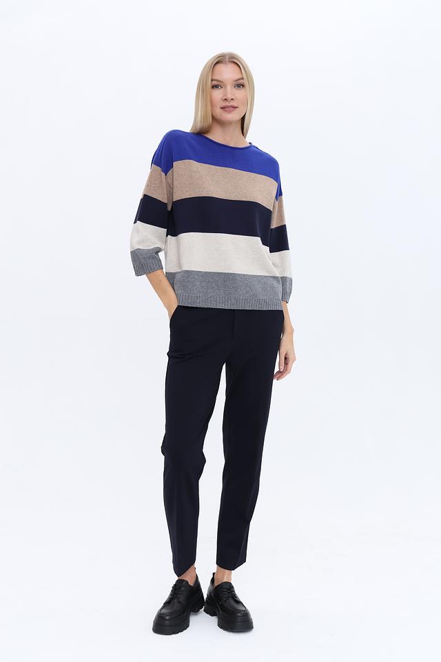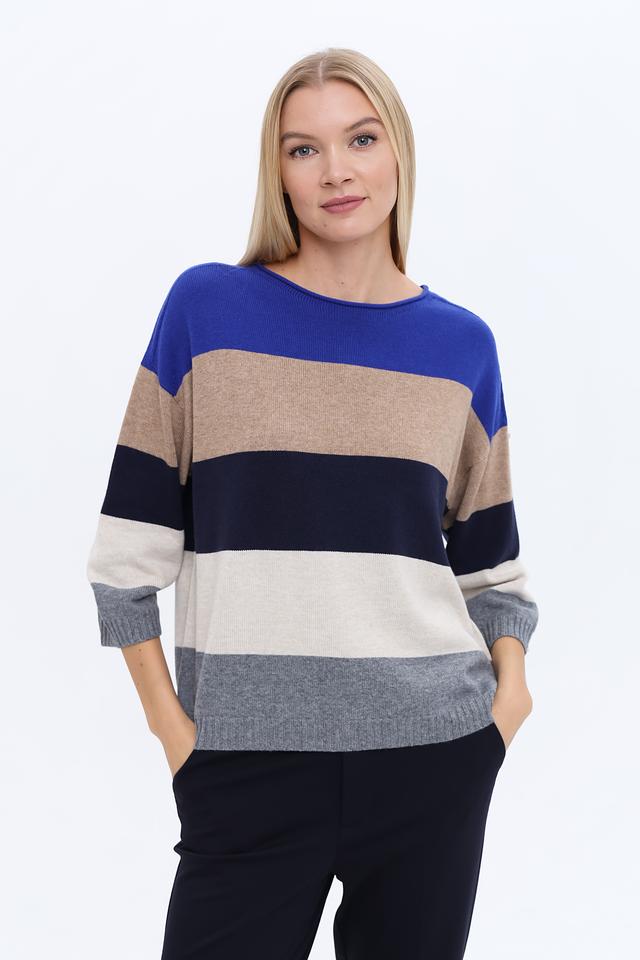 Дизайн пуловера выполнен в виде горизонтальных полос синего, бежевого и серого цветов, что придает ему современный и стильный вид. Круглый вырез горловины и рукава ¾ делают его универсальным для различных случаев.