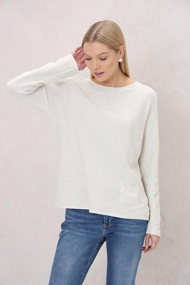 Пуловер имеет свободный крой, который не сковывает движения и позволяет создать расслабленный силуэт. Округлый вырез горловины делает его универсальным и подходящим для различных типов внешности. На левой стороне изделия расположен накладной карман, добавляющий функциональности и оригинальности.