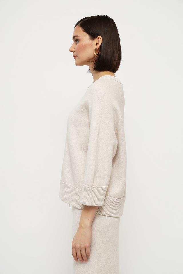 Пуловер имеет прямой крой, круглый вырез горловины и рукава три четверти. Мягкая текстура ткани обеспечивает комфорт в носке. Эластичные манжеты на рукавах и по низу изделия обеспечивают хорошую посадку по фигуре.