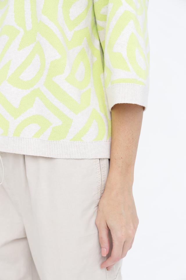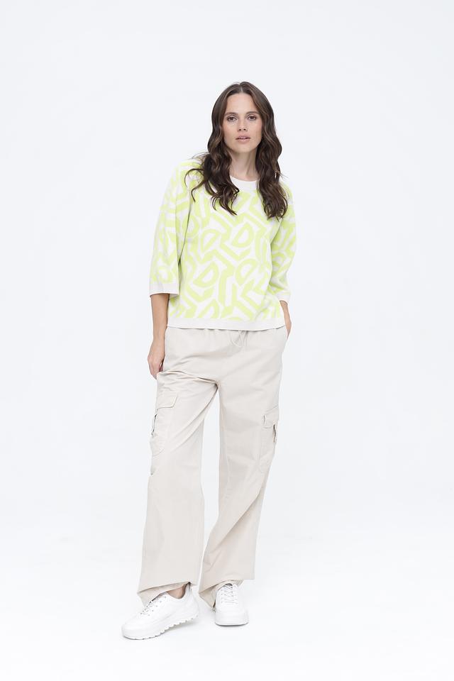 Этот стильный пуловер от бренда Oui станет ярким акцентом вашего образа. Модель выполнена в светло-зелёном цвете (лайм) и украшена крупным геометрическим принтом, который придает ей современный вид.