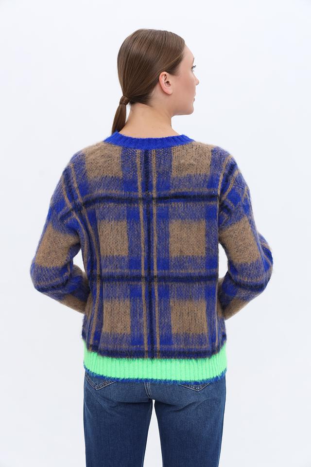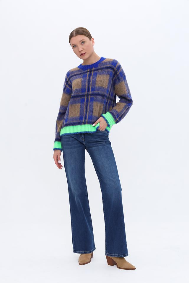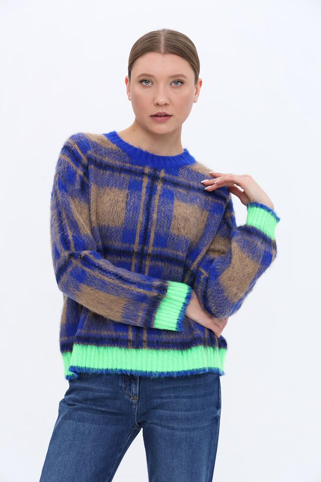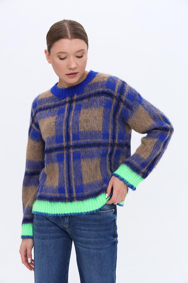 Стильный пуловер Oui синего цвета с ярким клетчатым узором и неоново-зелёной отделкой. Модель выполнена из мягкой пряжи с добавлением альпаки, что обеспечивает комфорт и тепло. Идеальный выбор для создания уютного и модного образа. Состав: полиакрил 45%, полиамид 35%, альпака 20%
