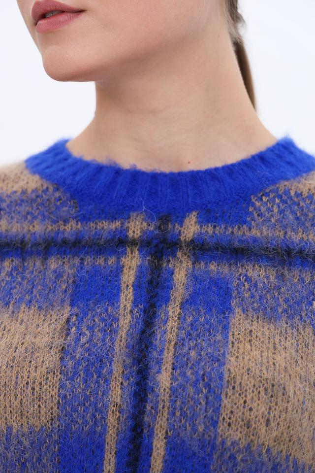 Этот пуловер от бренда Oui станет ярким акцентом в вашем гардеробе. Модель выполнена в насыщенном синем цвете и украшена крупной клеткой коричневых и бежевых оттенков.